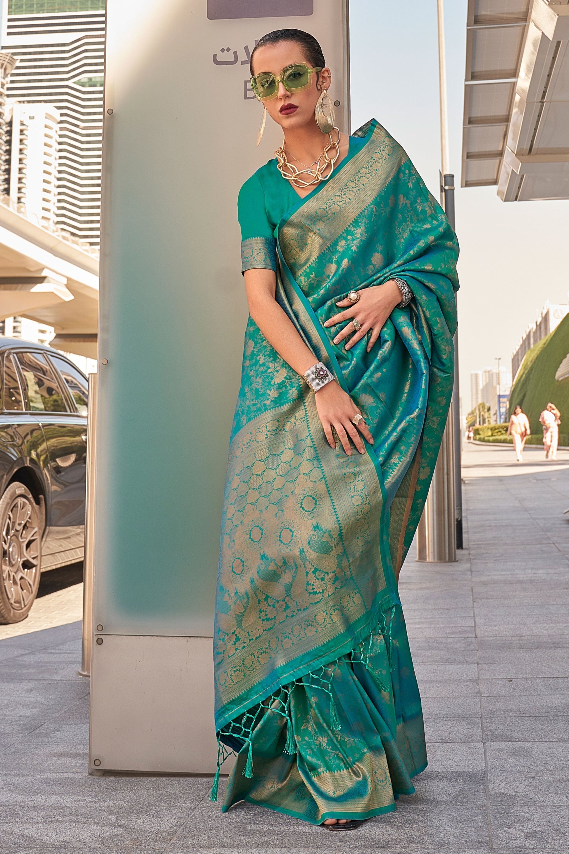 हरे रंग की खूबसूरत लुक वाली हथकरघा बुनाई वाली साड़ी
