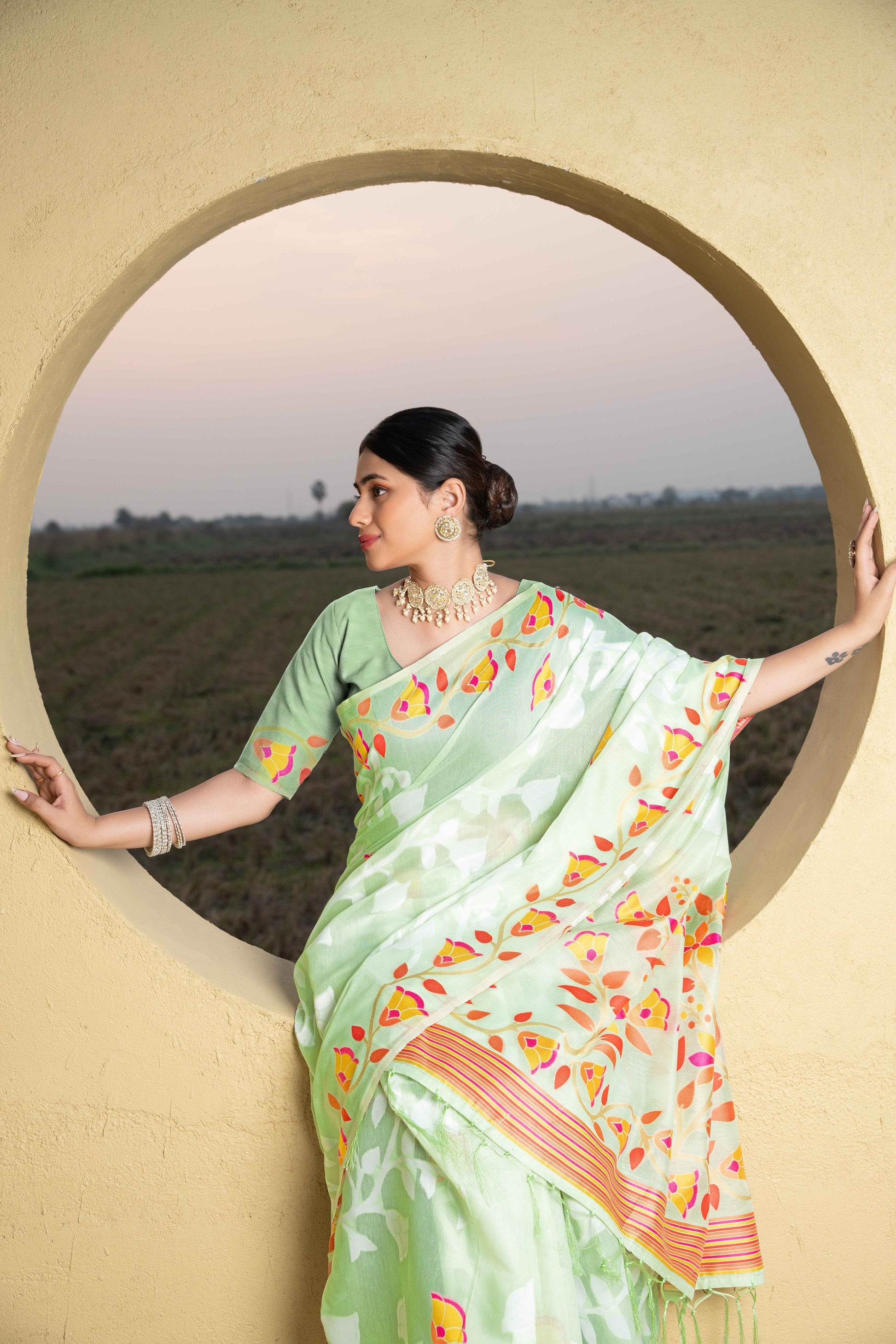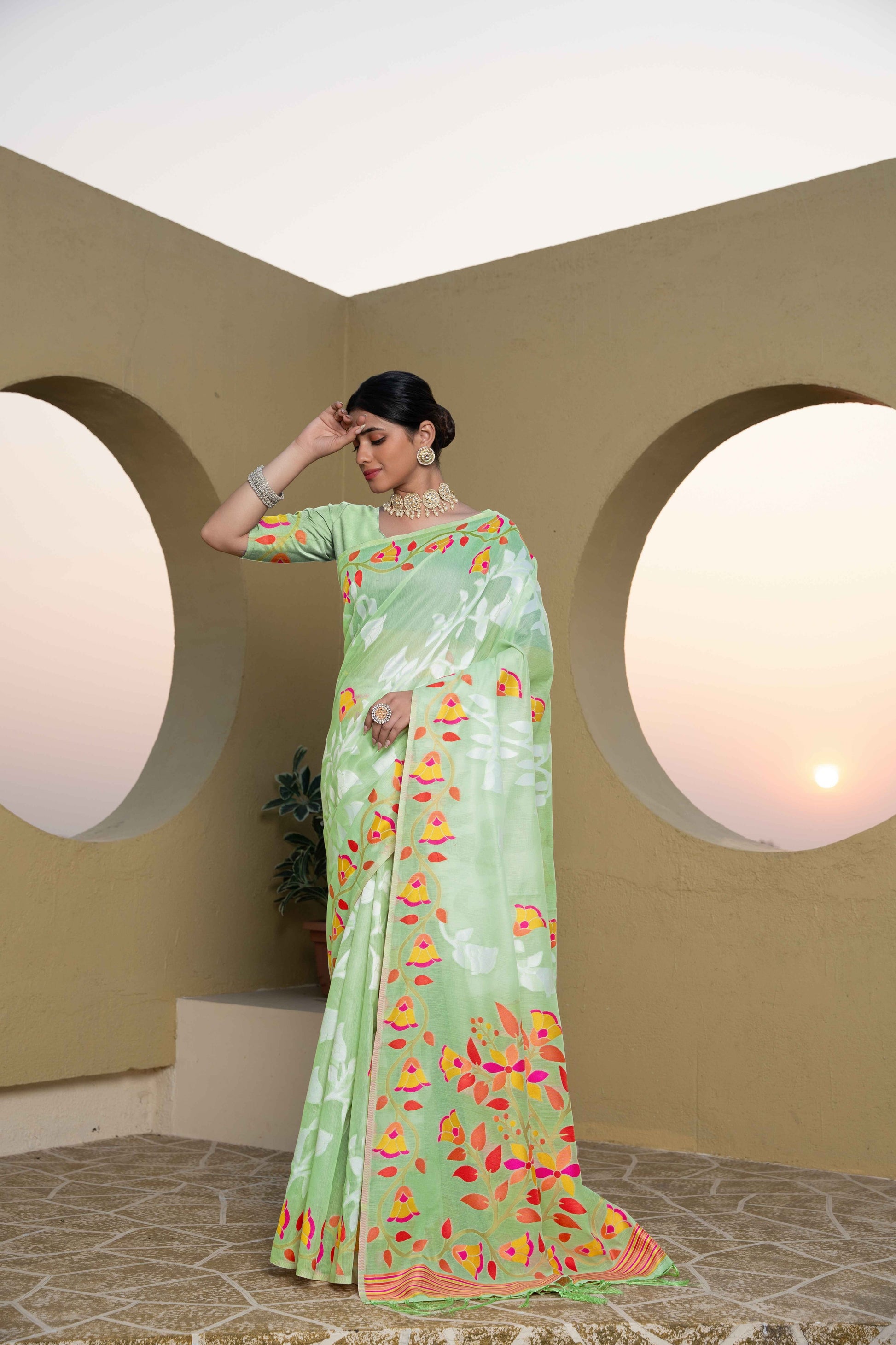हरे रंग की जामदानी सॉफ्ट कॉटन साड़ी अनस्टिच्ड ब्लाउज पीस के साथ