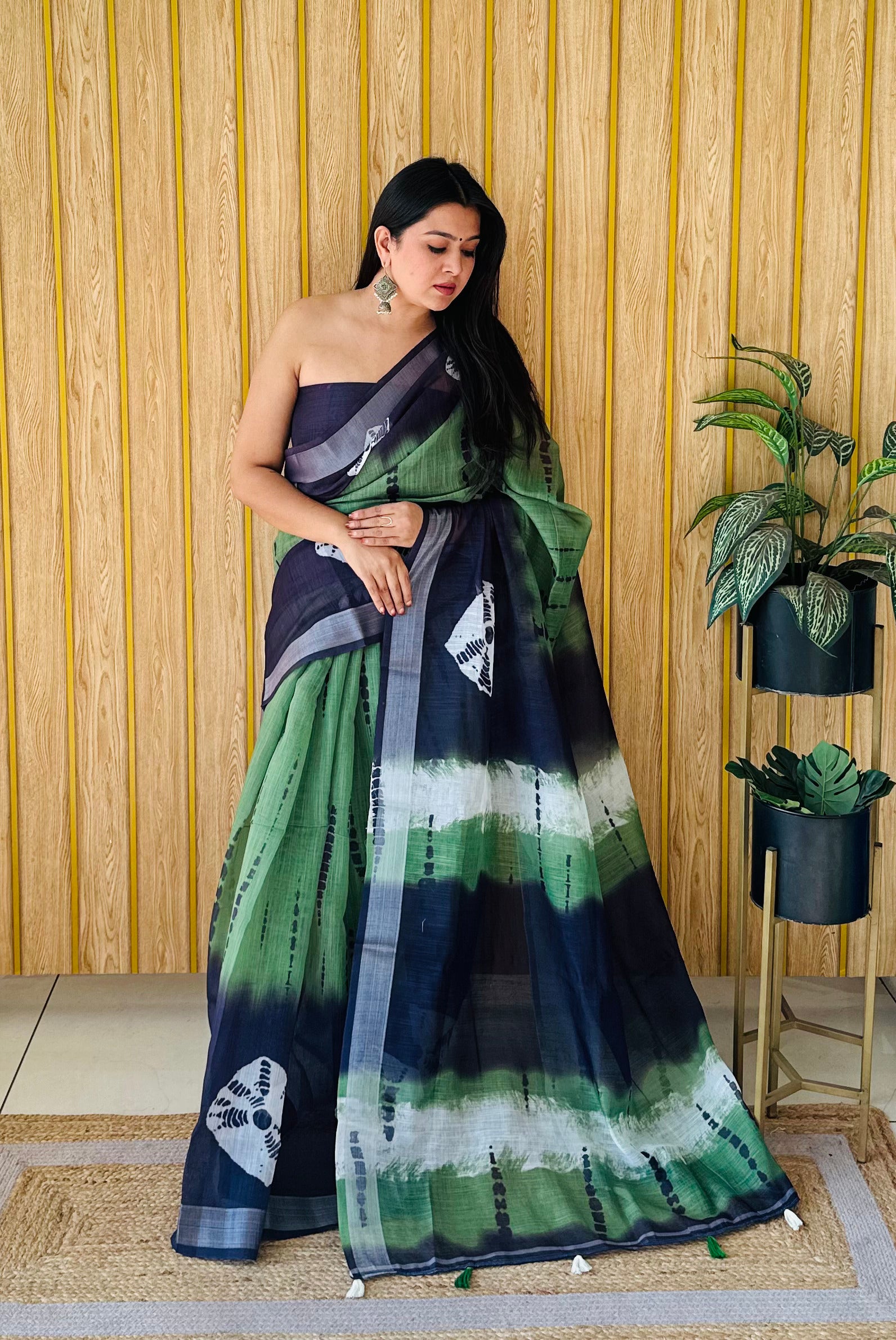 हरे रंग की प्रीमियम क्वालिटी सॉफ्ट लिनन कॉटन डिजिटल प्रिंट साड़ी सिल्वर बॉर्डर के साथ