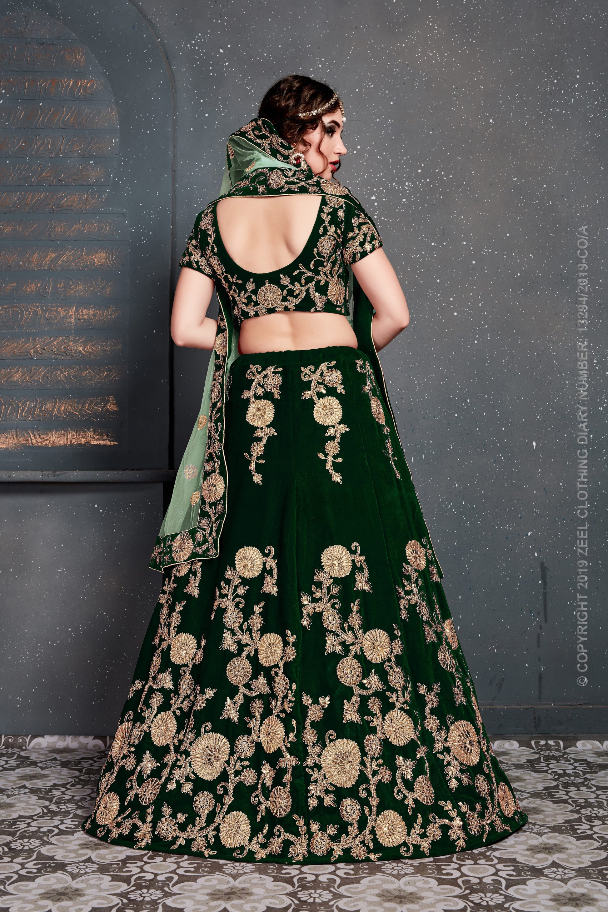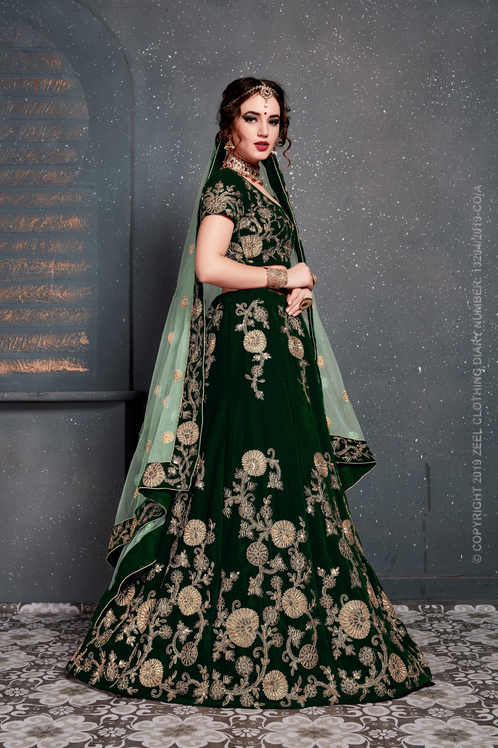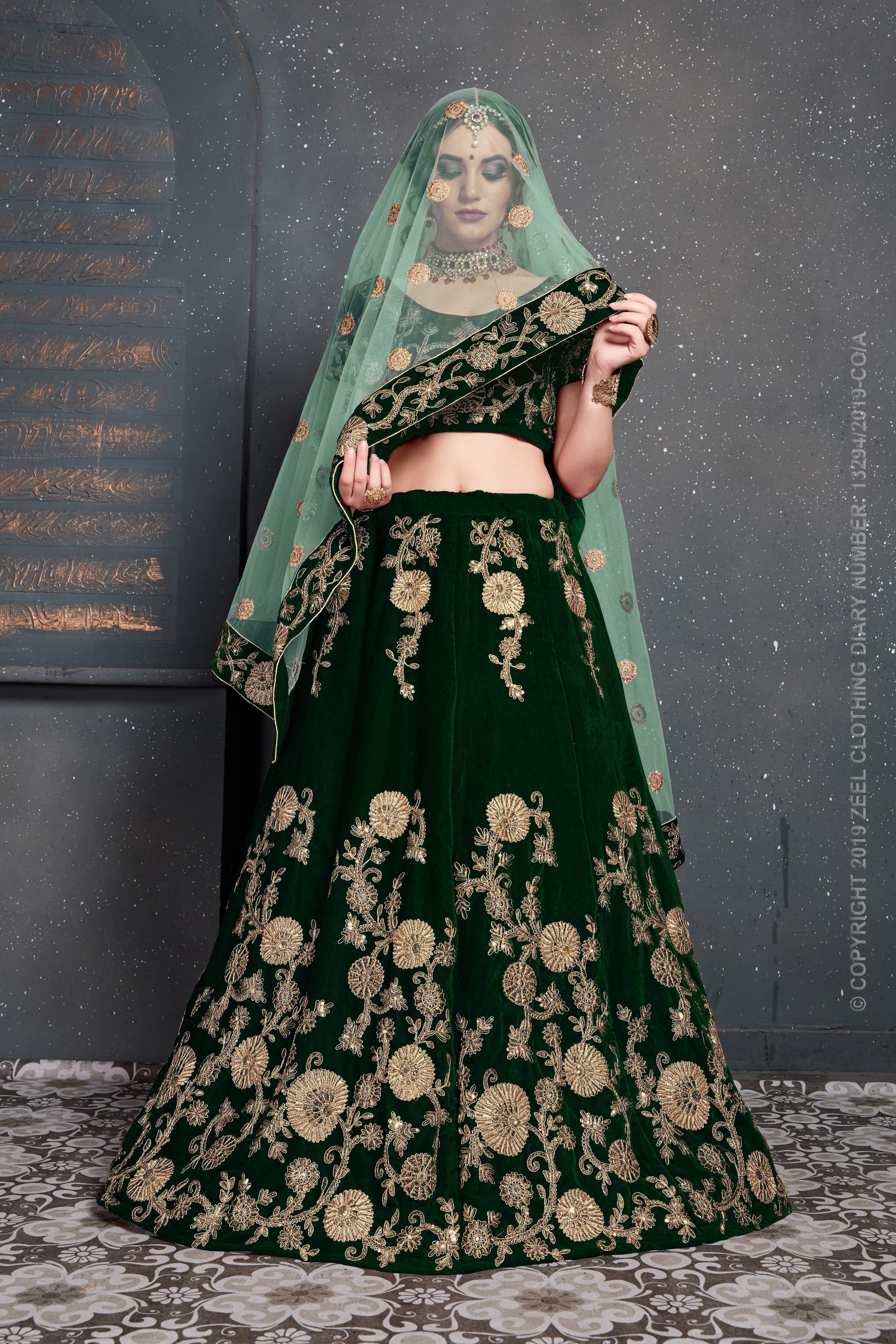 हरे रंग की मखमली डोरी, ज़री और सेक्विन कढ़ाई का काम लहंगा चोली