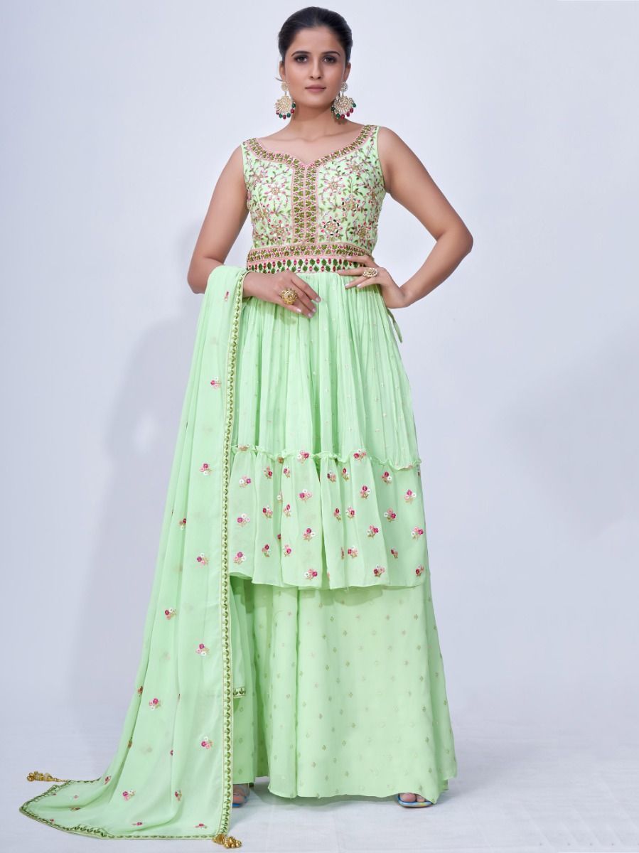 ग्रीन मिरर वर्क मल्टी एम्ब्रॉयडरी शिफॉन पलाज़ो सूट