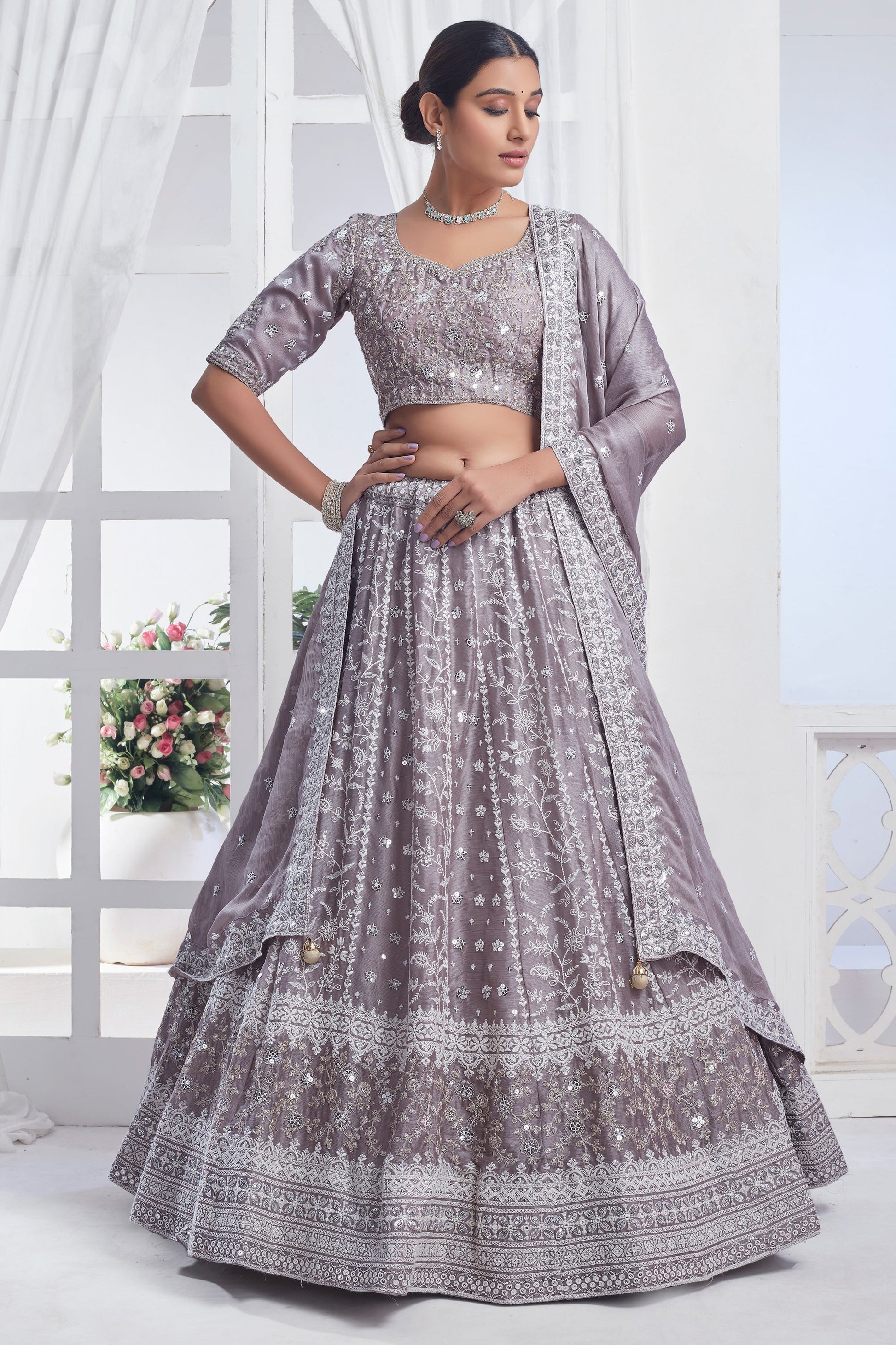 ग्रे रंग का आकर्षक सेक्विन वर्क शिफॉन फैब्रिक लहंगा