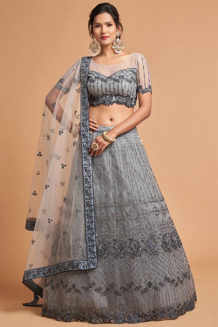 ग्रे कलर नेट फैब्रिक संगीत वियर कढ़ाई वर्क के साथ कीमती लहंगा