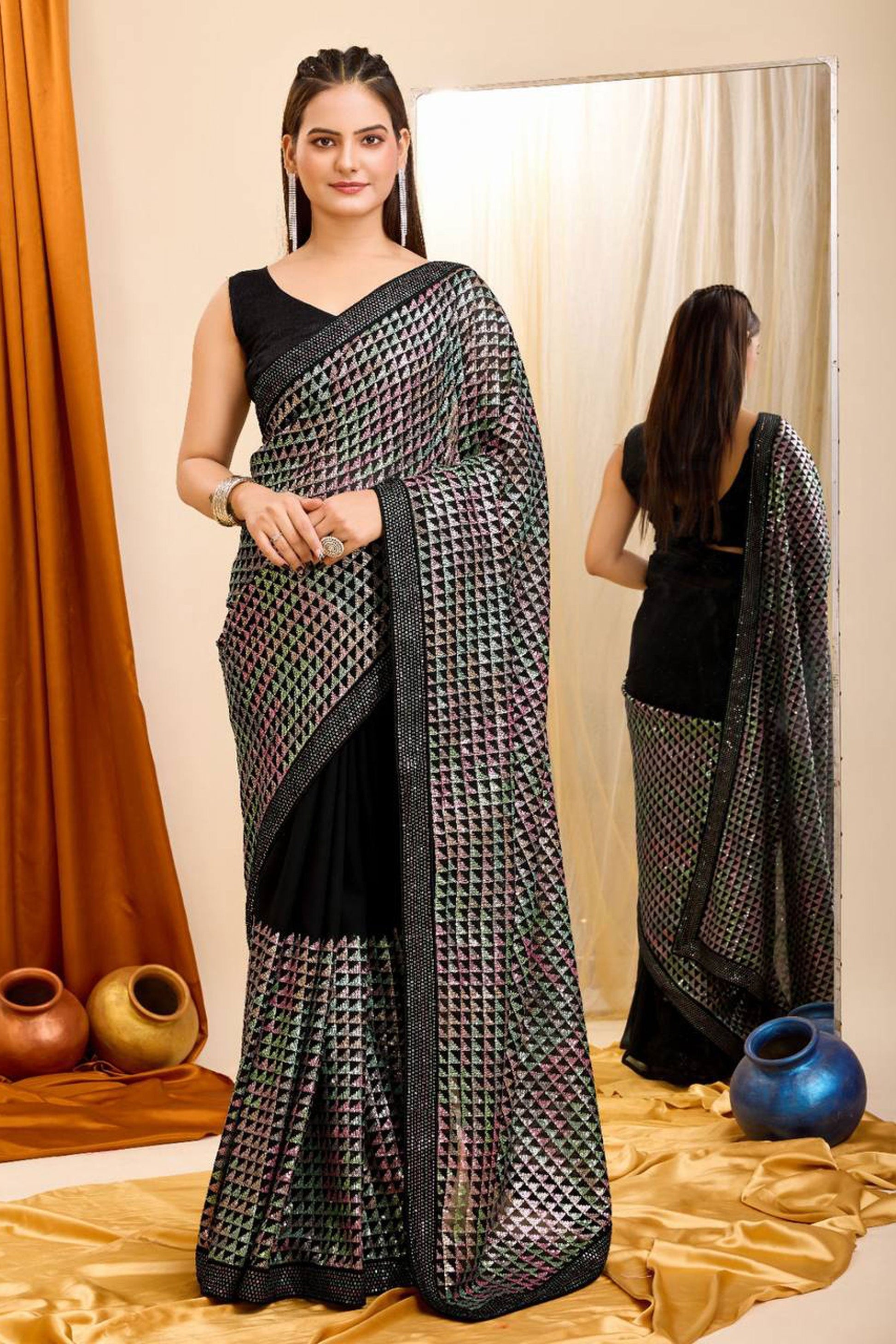 काले रंग की साड़ी पर हैवी जॉर्जेट फैब्रिक सेक्विन वर्क