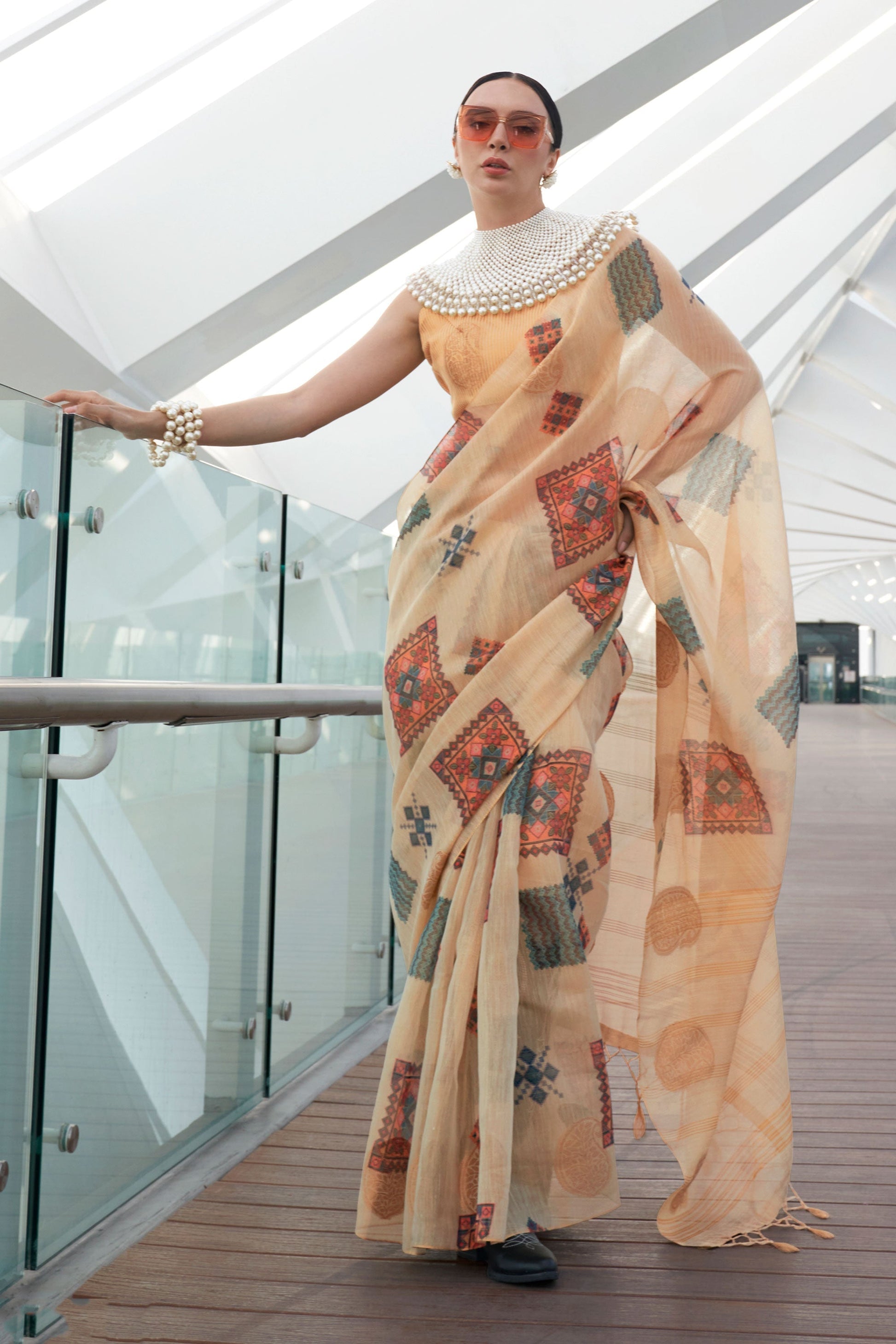 आर्ट सिल्क फैब्रिक क्रीम कलर साड़ी पर अविश्वसनीय मुद्रित कार्य