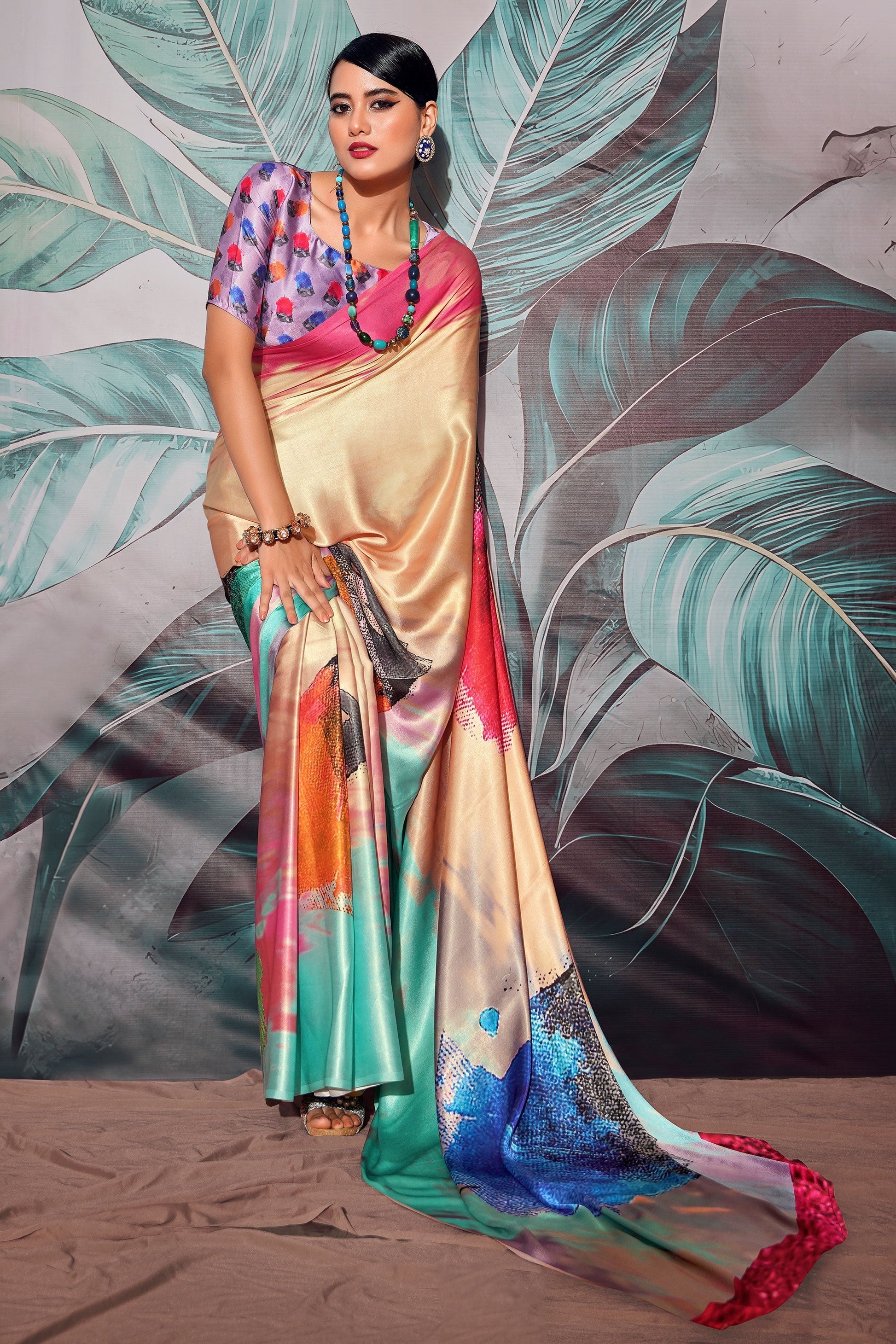 सरल डिजिटल मुद्रित क्रीम रंग साटन कपड़े साड़ी