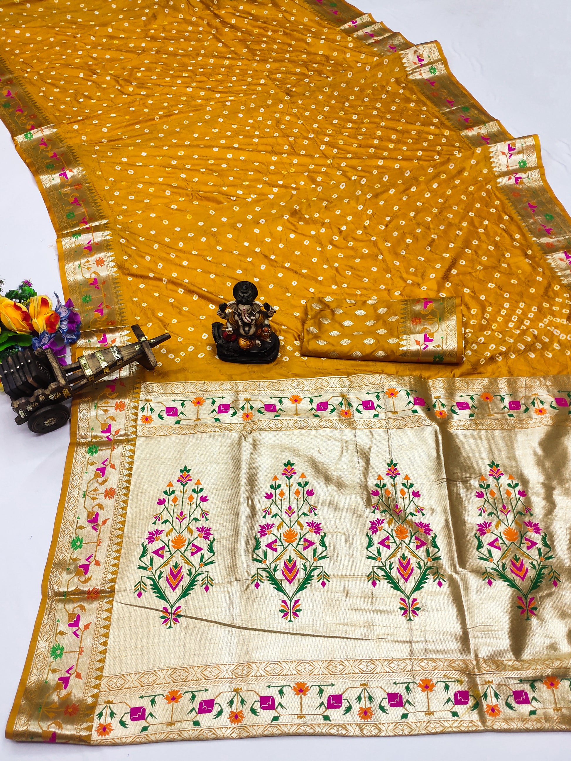 जरी पैठानी बुनाई बॉर्डर के साथ पीली जानकी डोला मुलायम रेशम बंधेज साड़ी