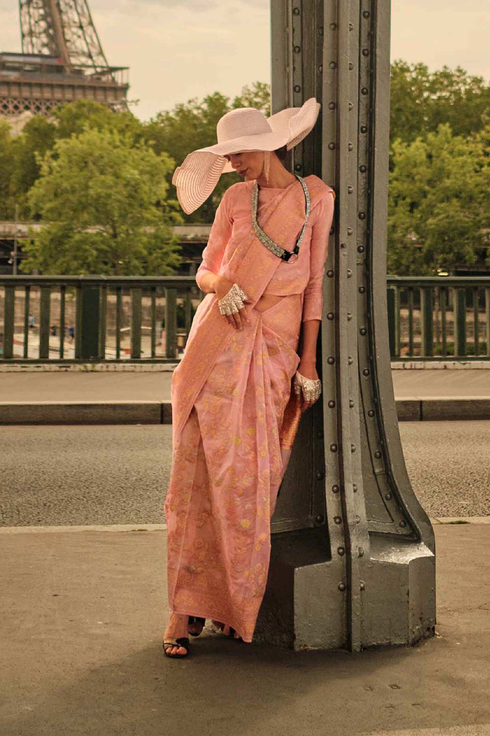 टेक्स्ट ब्लॉक काइरा सिल्क ऑरेंज फ्लोरल वन मिनट साड़ी