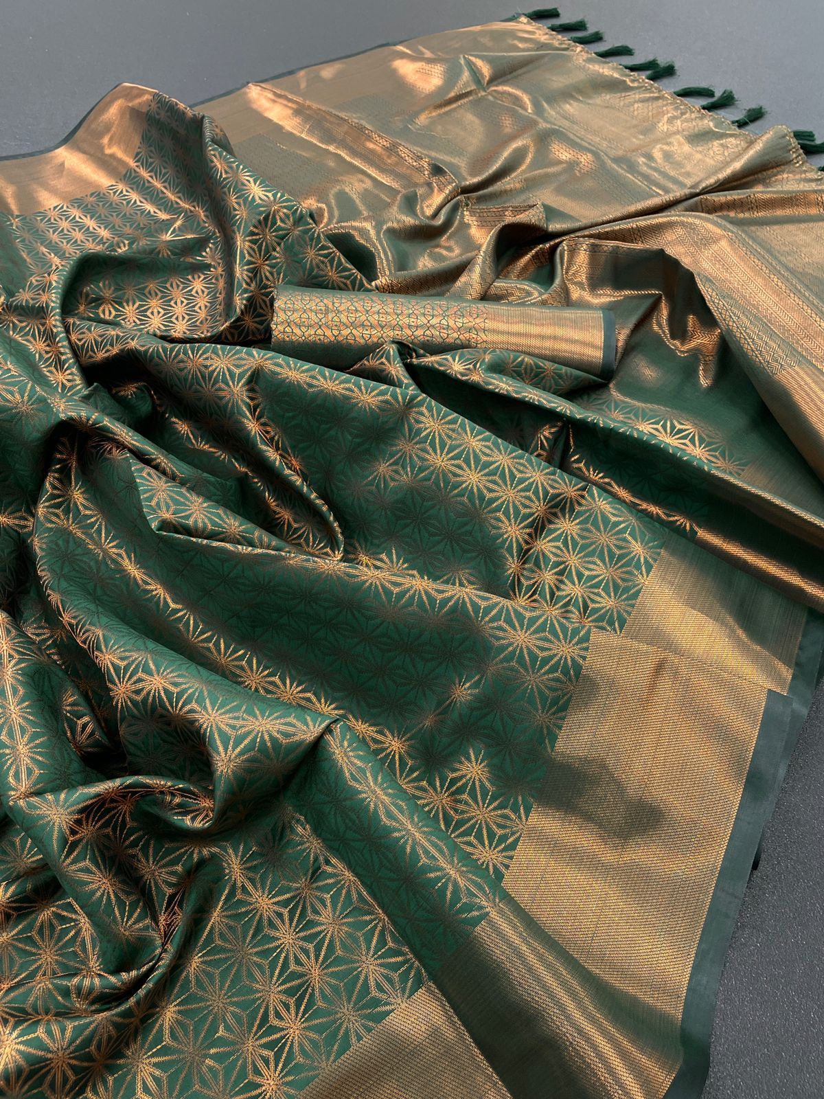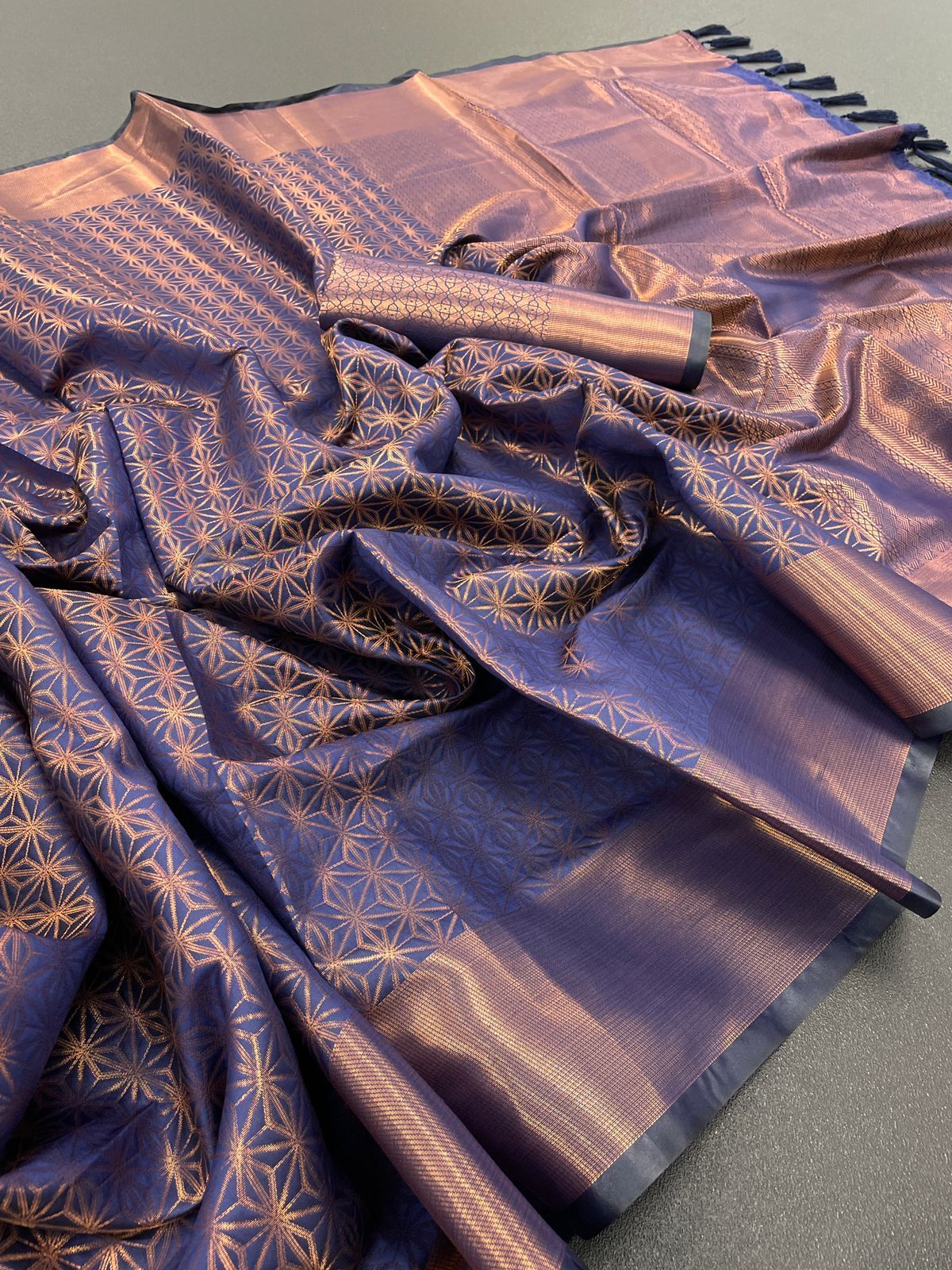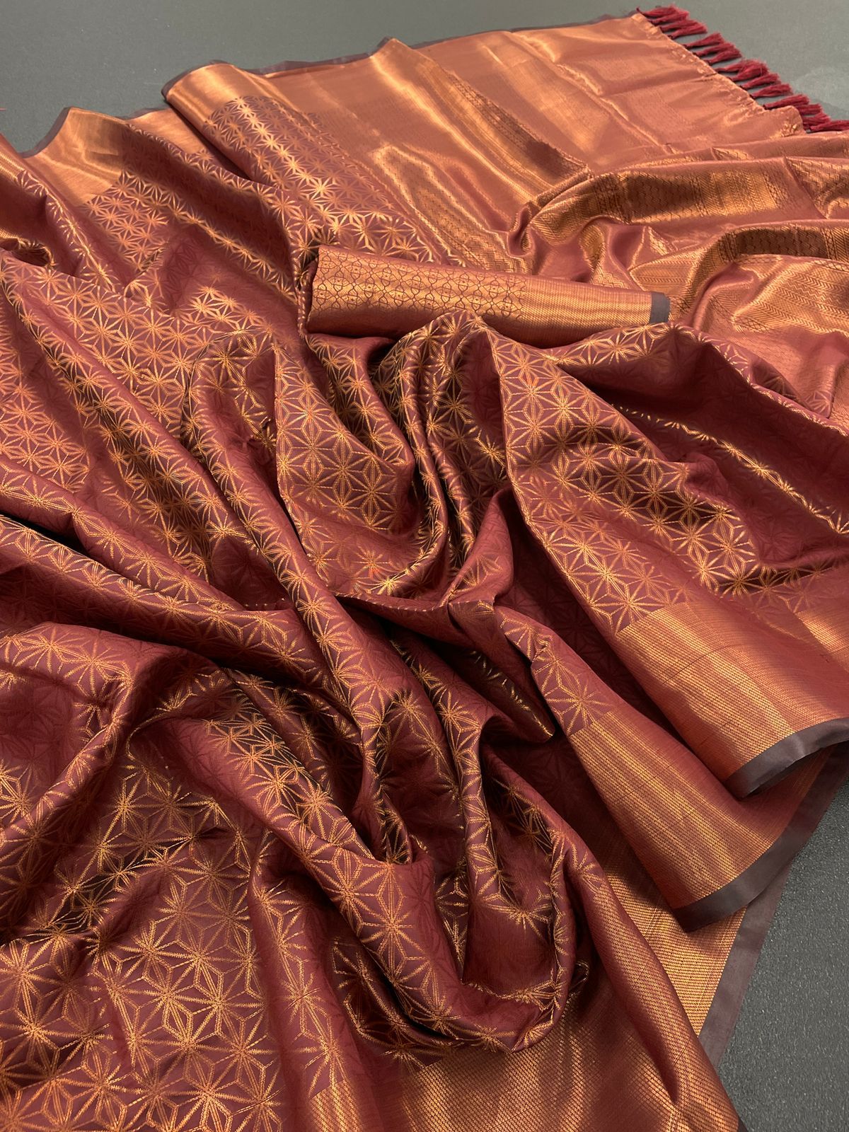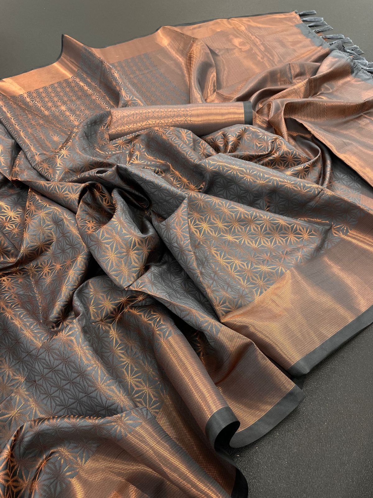 शानदार तांबे की जरी से बुनी कांजीवरम साड़ी अपनी चमकदार अपील के कारण अद्वितीय है।