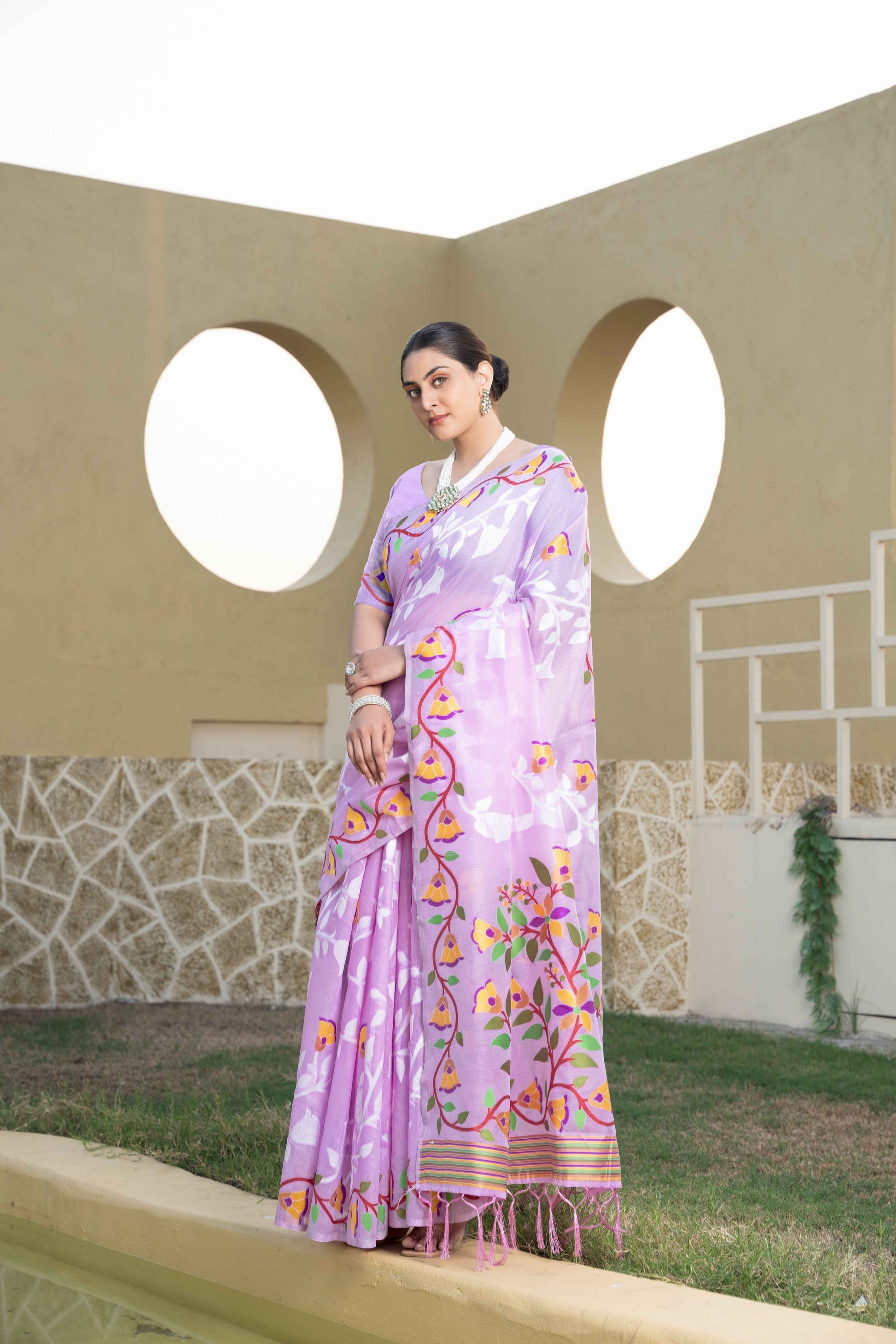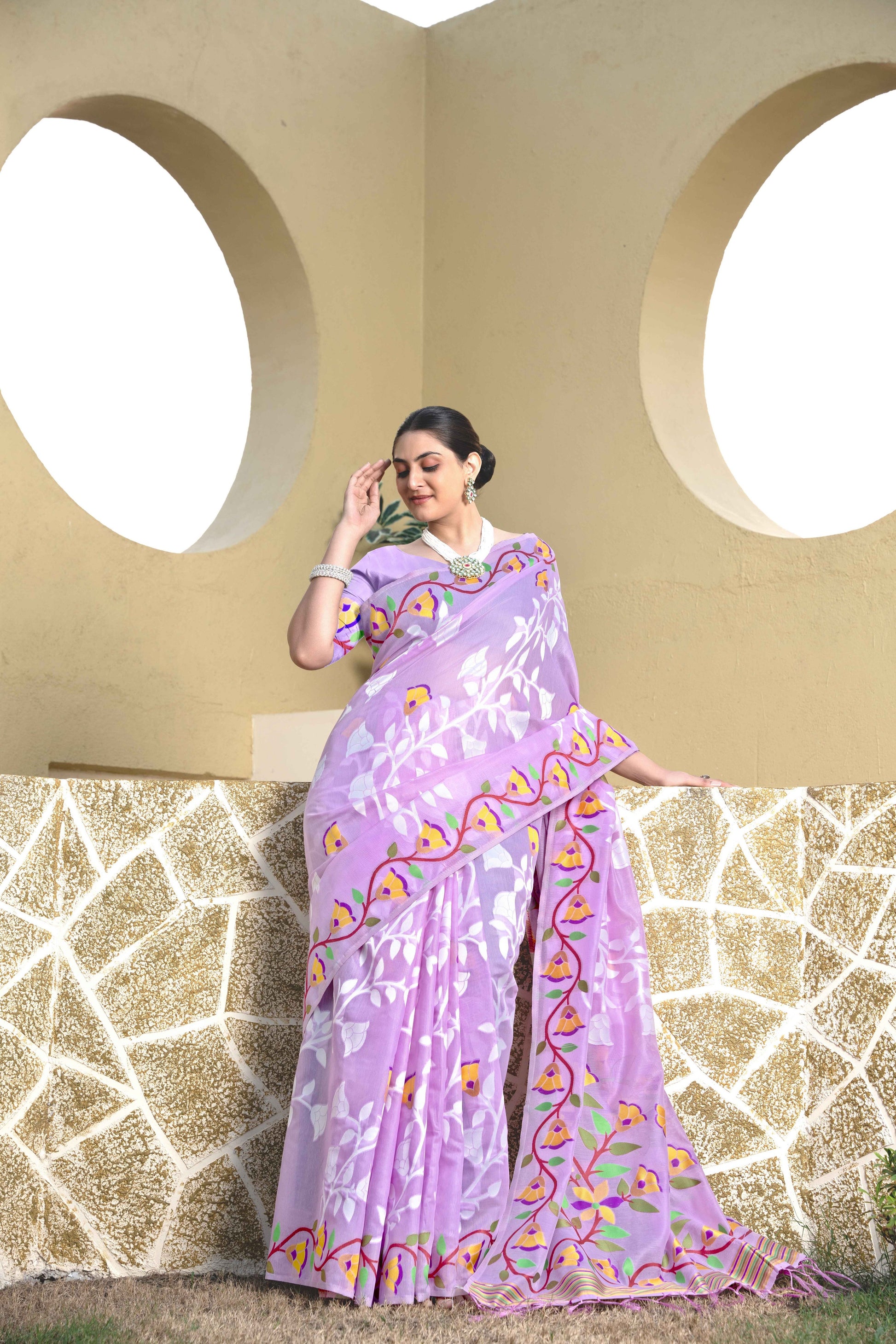 लैवेंडर रंग जामदानी सॉफ्ट कॉटन साड़ी अनस्टिच्ड ब्लाउज पीस के साथ