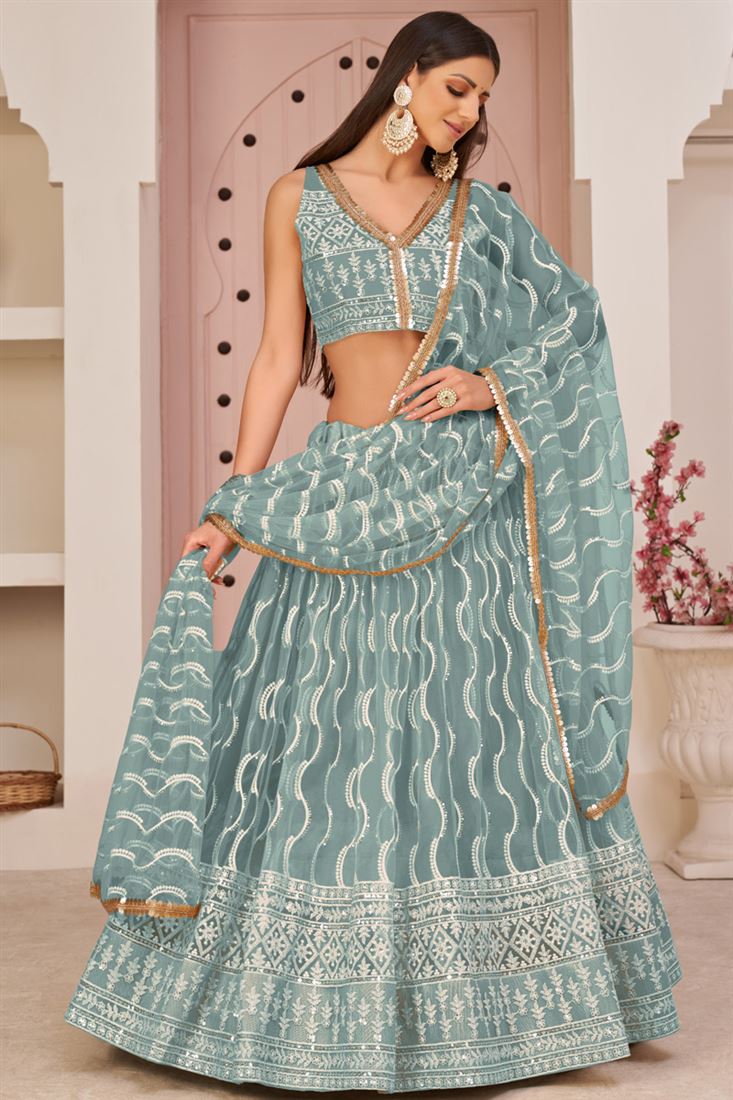 संगीत में पहनने के लिए लाइट सियान रंग का शानदार नेट लहंगा