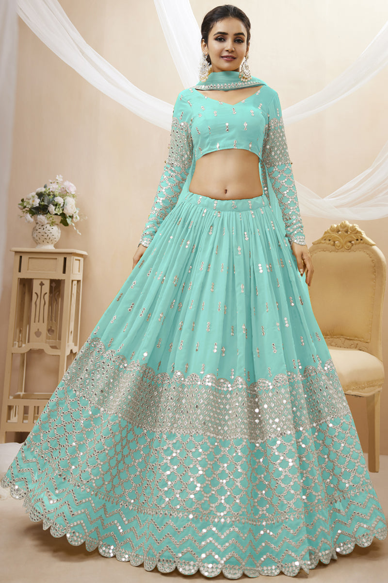 टेक्स्ट ब्लॉक लाइट सियान कलर रिसेप्शन वियर जॉर्जेट फैब्रिक कढ़ाई लहंगा चोली