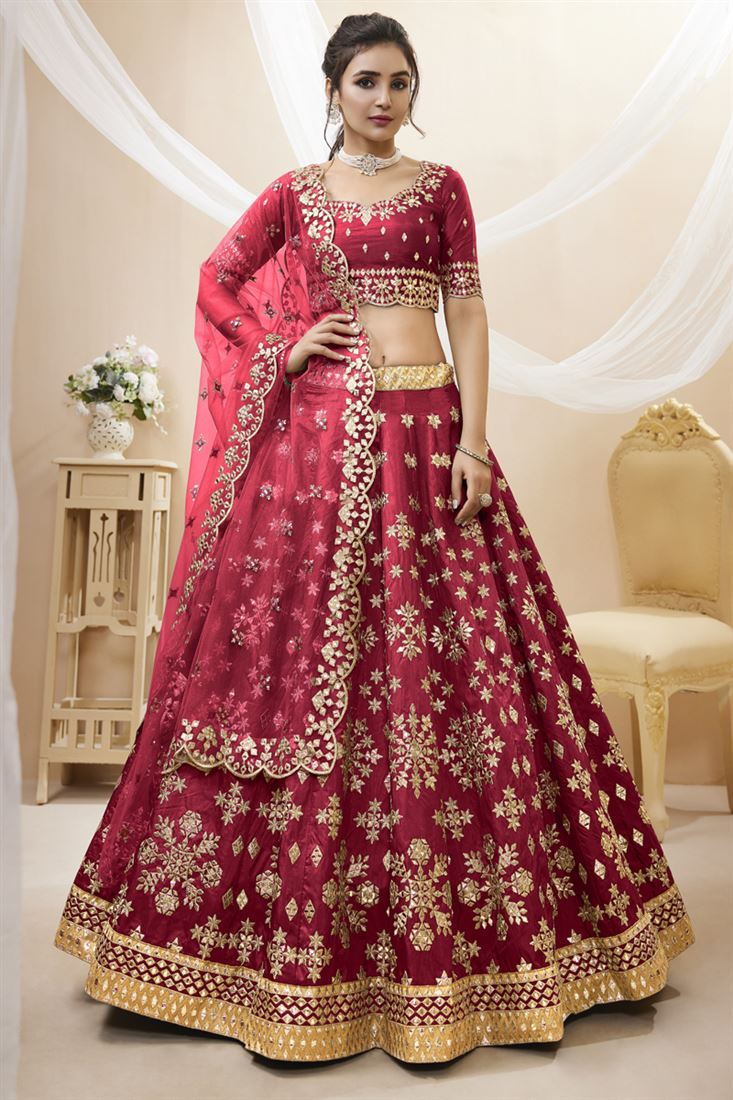आर्ट सिल्क फैब्रिक पर मैरून रंग की कढ़ाई का काम सुंदर लहंगा चोली