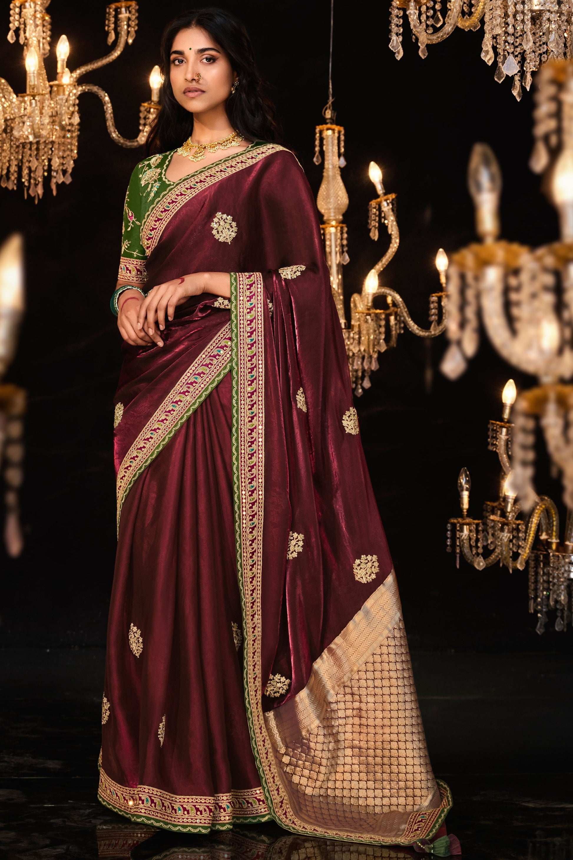 कढ़ाई के काम के साथ मैरून रंग टिशू फैब्रिक विशेष साड़ी