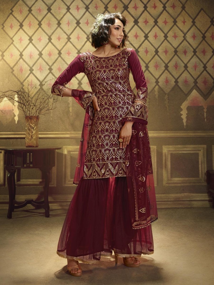 मैरून नेट कढ़ाई पार्टीवियर शरारा सूट