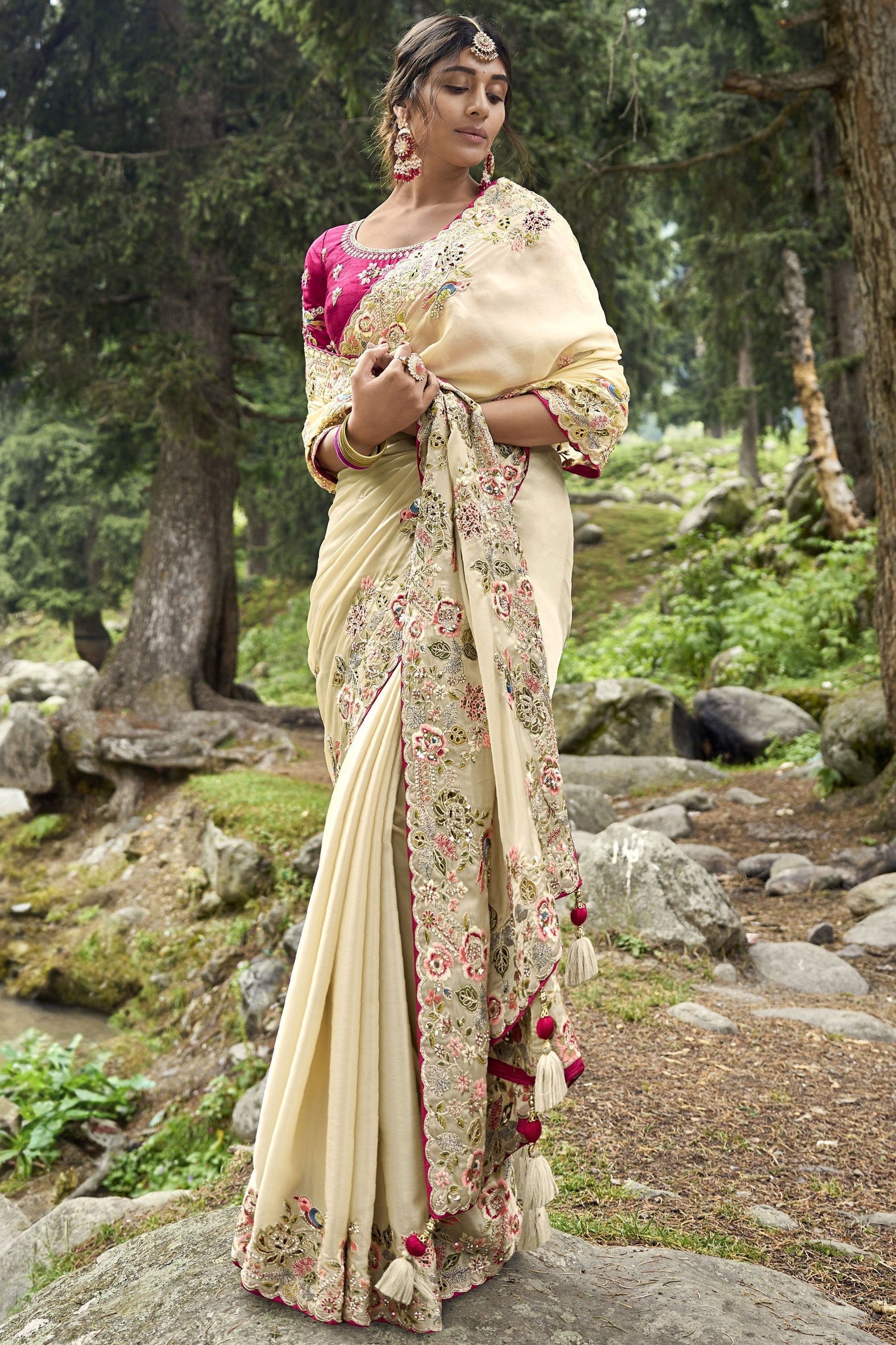 बेज रंग में फैंसी सिल्क फैब्रिक साड़ी पर अद्भुत कढ़ाई का काम