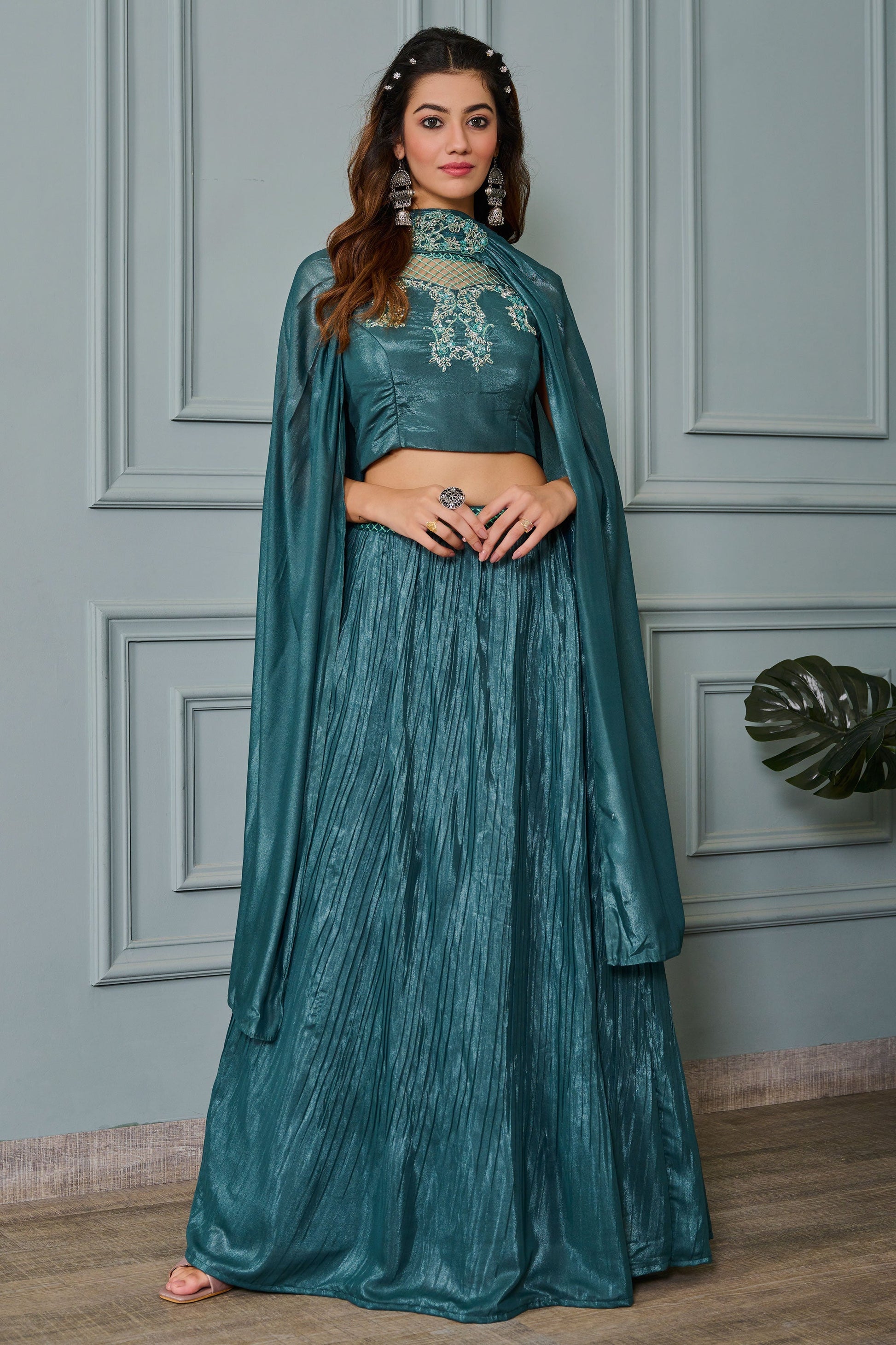 टेक्स्ट ब्लॉक आर्ट सिल्क फैब्रिक पर अद्भुत सेक्विन वर्क टील रंग में रेडीमेड लहंगा