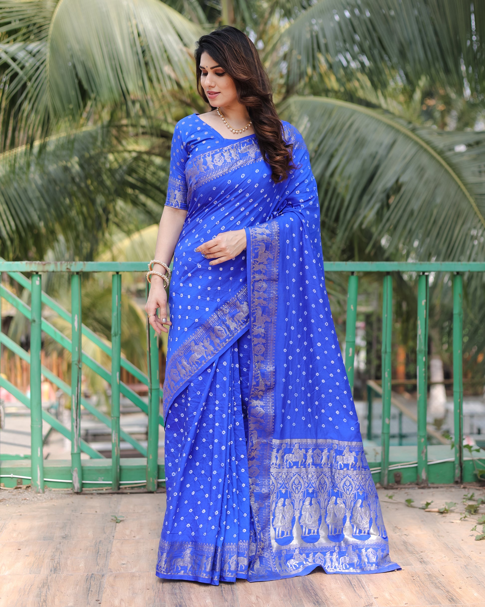 साड़ी का कपड़ा:- शुद्ध बंधेज सिल्क साड़ी ज़री बुनाई बॉर्डर और समृद्ध पल्लू के साथ सुंदर डिज़ाइन और बड़ी चौड़ी बॉर्डर के साथ