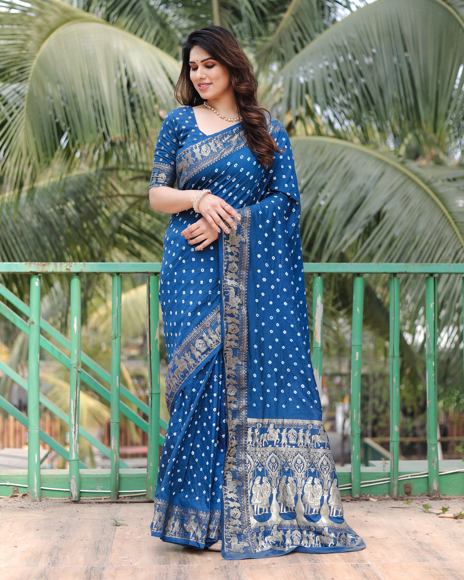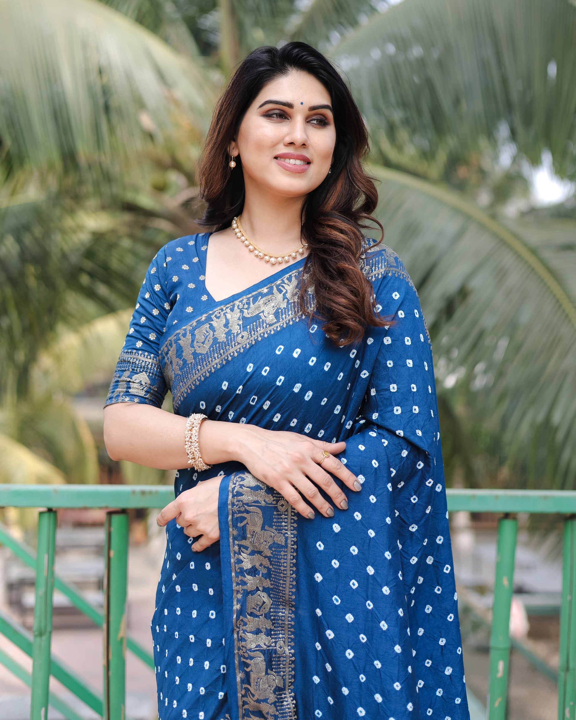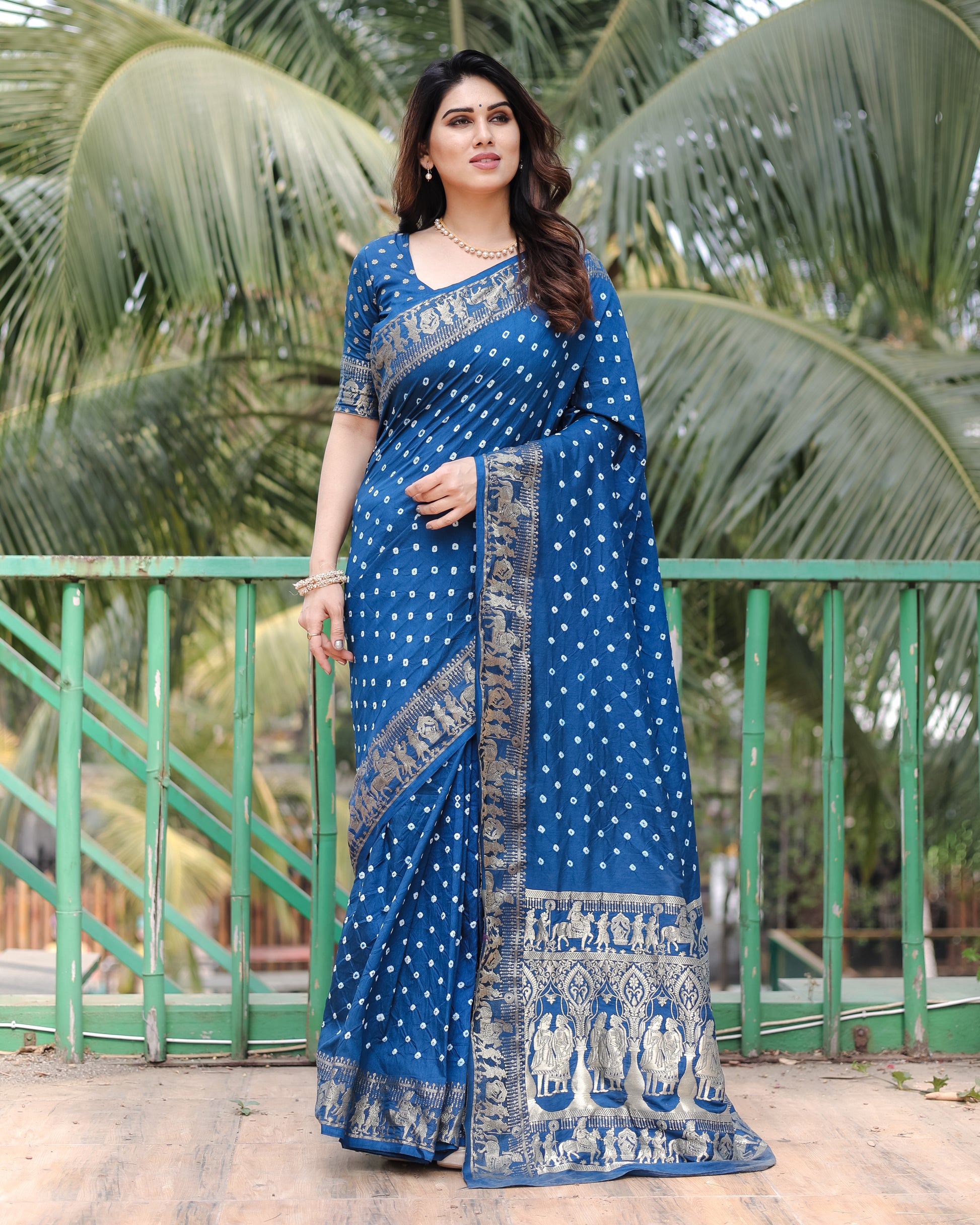 ज़री बुनाई बॉर्डर के साथ नेवी ब्लू मौसमी शुद्ध बंधेज सिल्क साड़ी