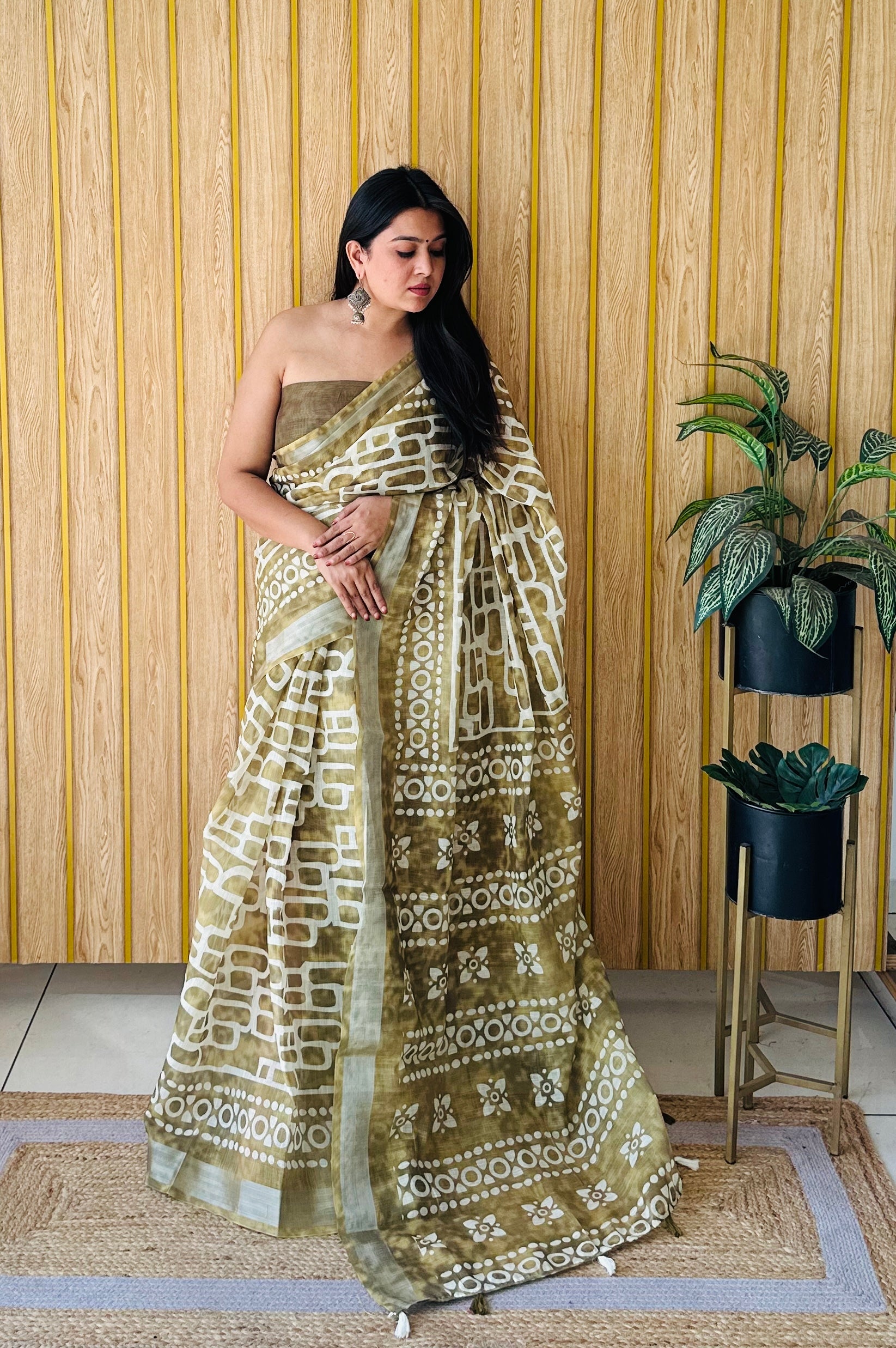 टेक्स्ट ब्लॉक मेहंदी रंग प्रीमियम गुणवत्ता नरम लिनन कपास डिजिटल प्रिंट साड़ी चांदी सीमा के साथ