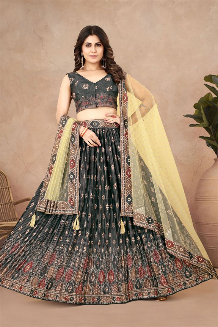 टेक्स्ट ब्लॉक मल्टी कलर डिजिटल प्रिंटेड क्रश्ड वर्क फंक्शन लहंगा चिनॉन फ़ैब्रिक में