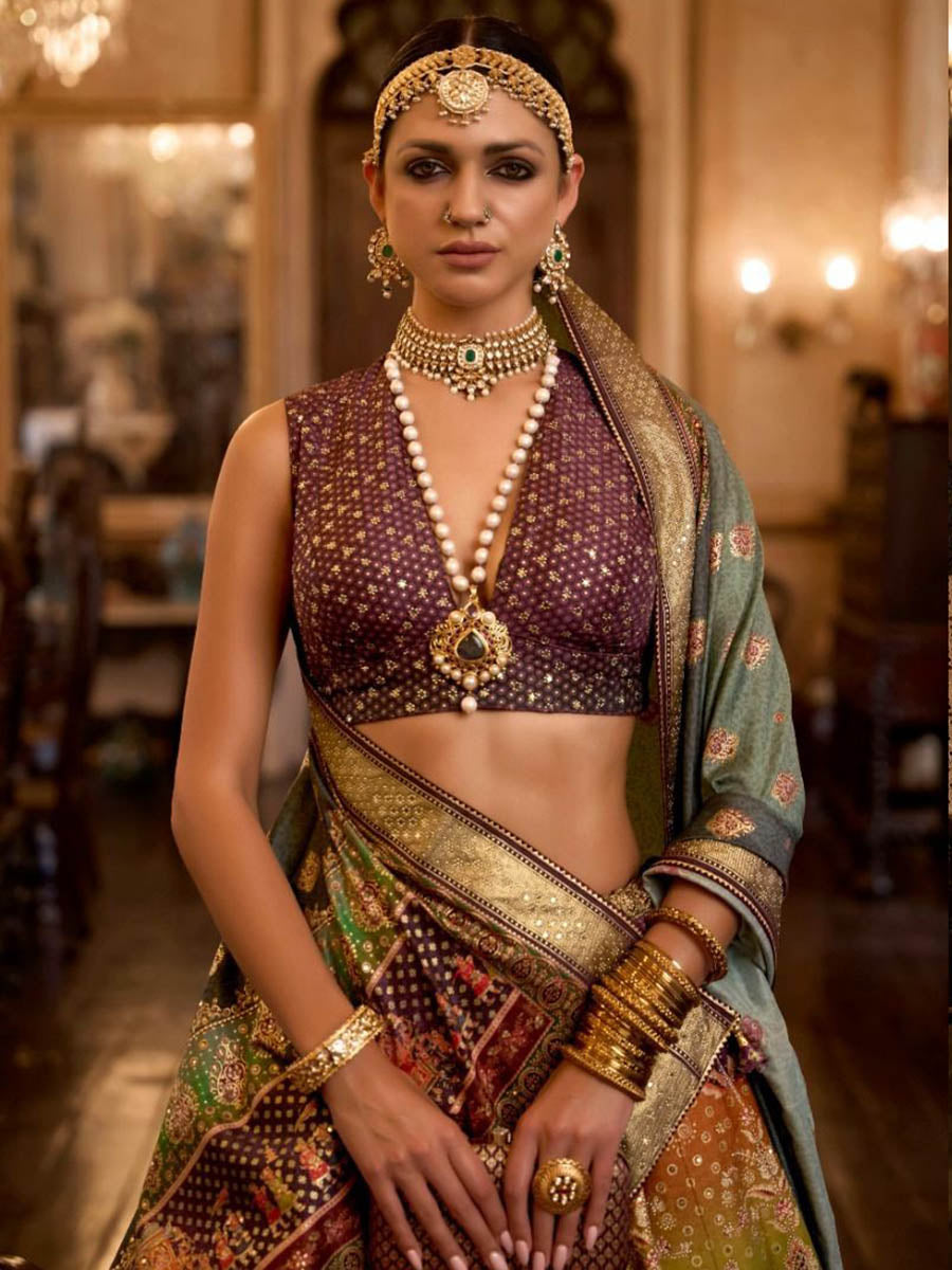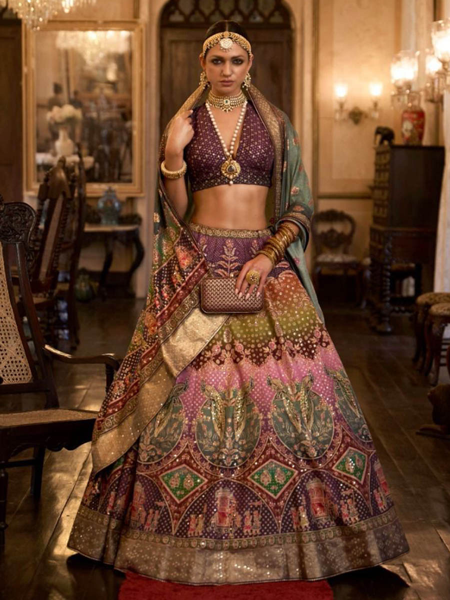 टेक्स्ट ब्लॉक मल्टीकलर रजवाड़ी सिल्क मिरर वर्क ब्राइडल डिज़ाइनर लहंगा