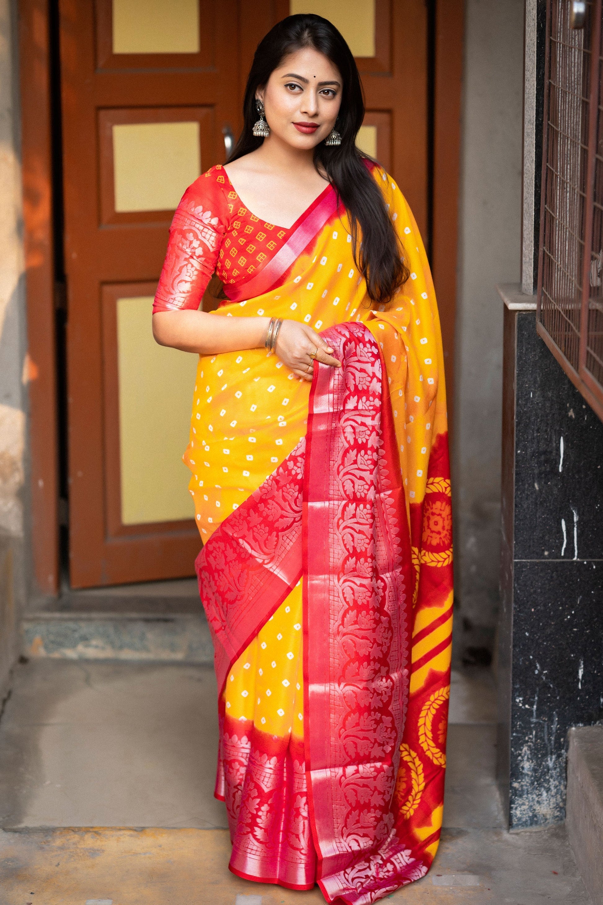 टेक्स्ट ब्लॉक सरसों के रंग की उत्तम बंधनी स्टाइल प्रिंटेड आर्ट सिल्क साड़ी