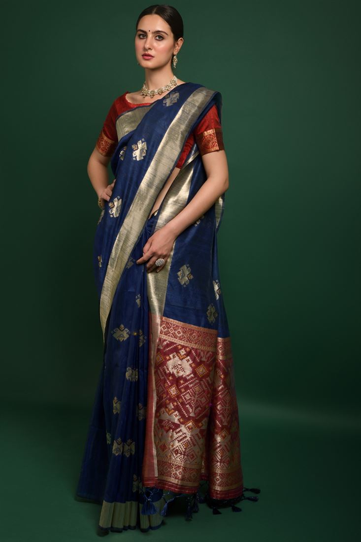 त्यौहार के अवसर पर पहनने के लिए नेवी ब्लू रंग की आर्ट सिल्क फैब्रिक की आकर्षक बुनाई वाली साड़ी
