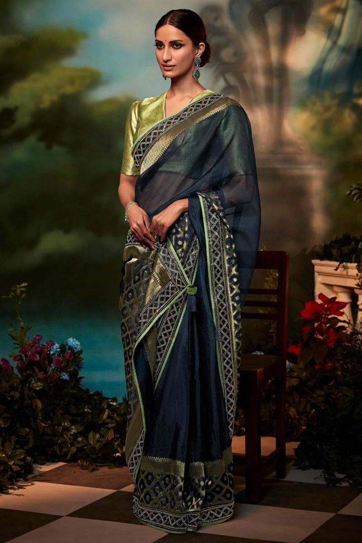 टेक्स्ट ब्लॉक नेवी ब्लू कलर आर्ट सिल्क फ़ैब्रिक स्टाइलिश फैंसी वर्क साड़ी