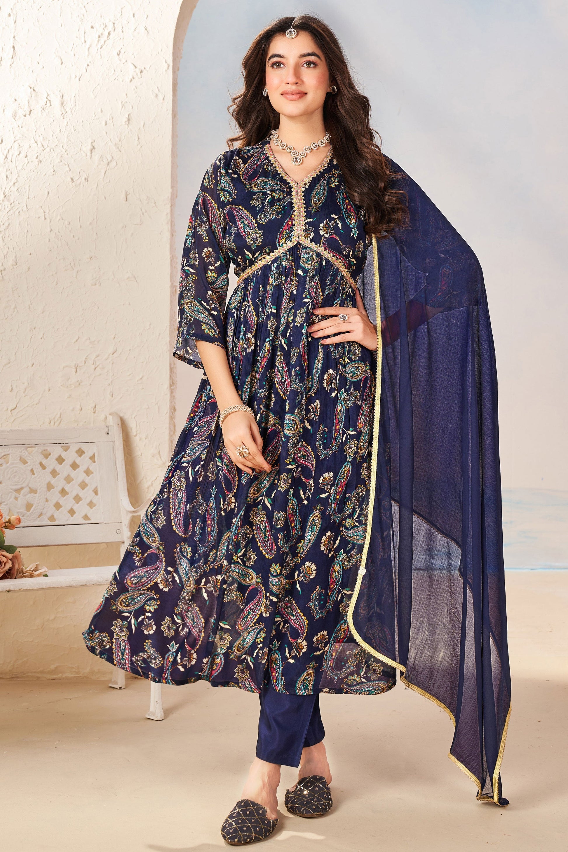 नेवी ब्लू कलर प्रिंटेड रेडीमेड अनारकली सलवार कमीज चिनॉन फैब्रिक में