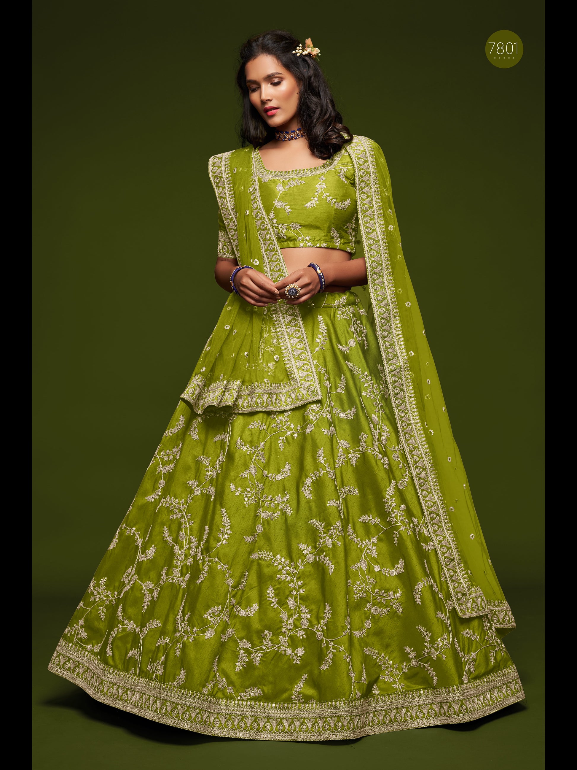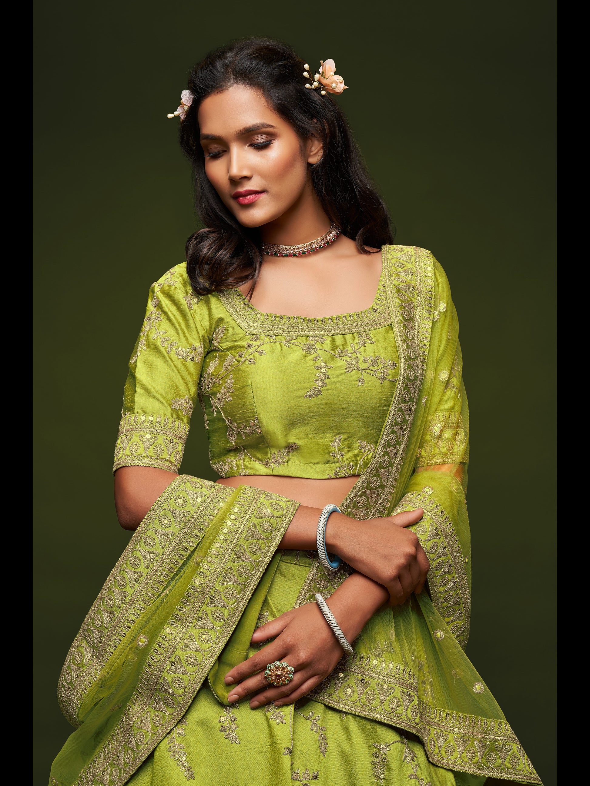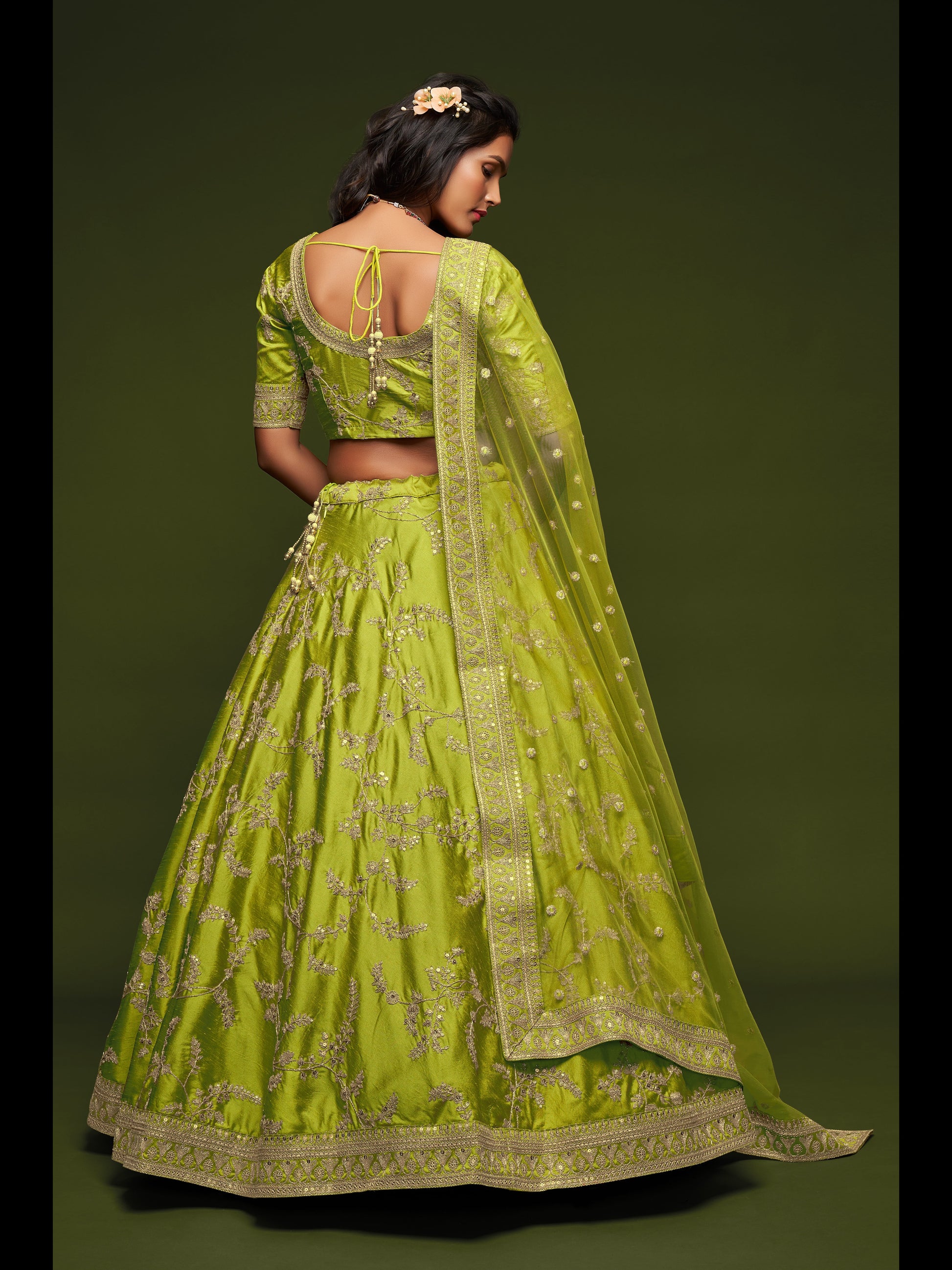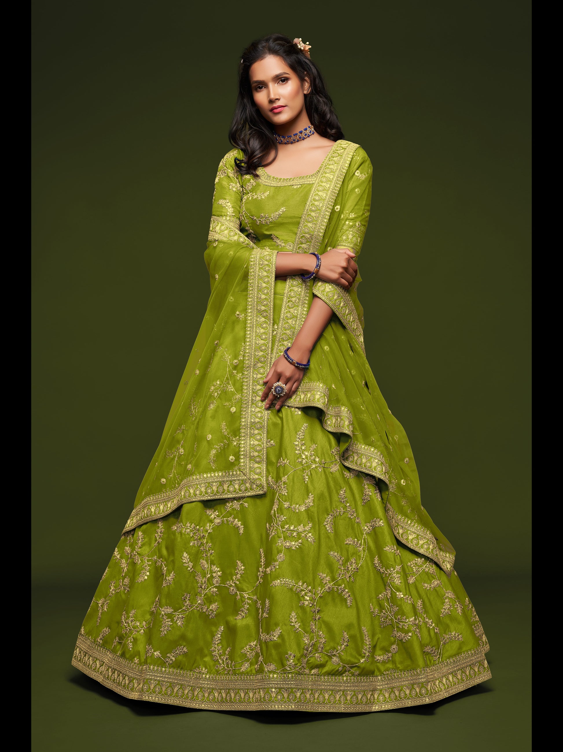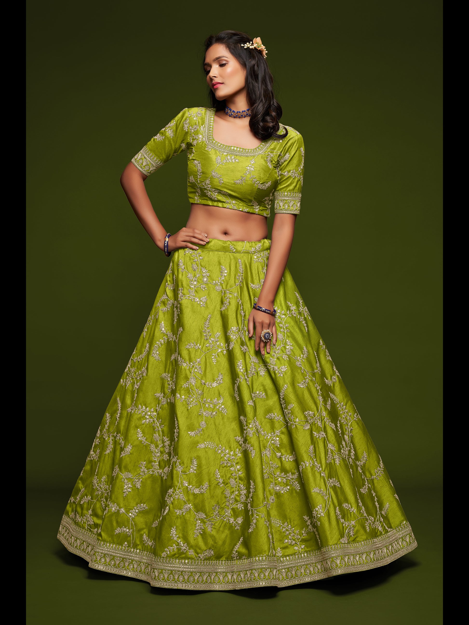 नियॉन कलर आर्ट सिल्क थ्रेड, ज़री, डोरी और सेक्विन कढ़ाई वर्क लहंगा चोली