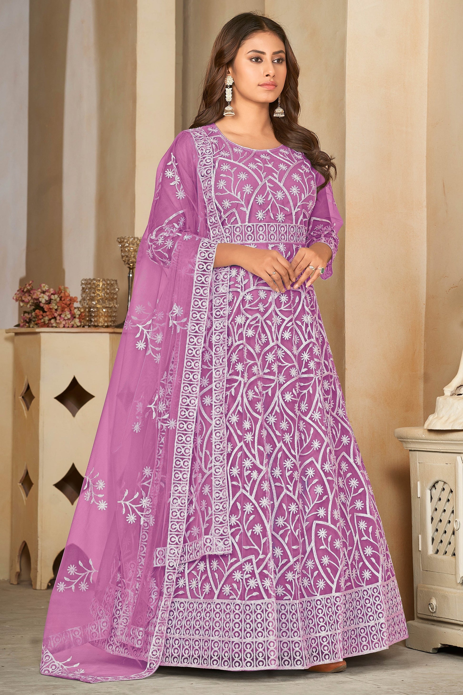 गुलाबी रंग में नेट फैब्रिक कढ़ाई वाला सुंदर अनारकली सूट