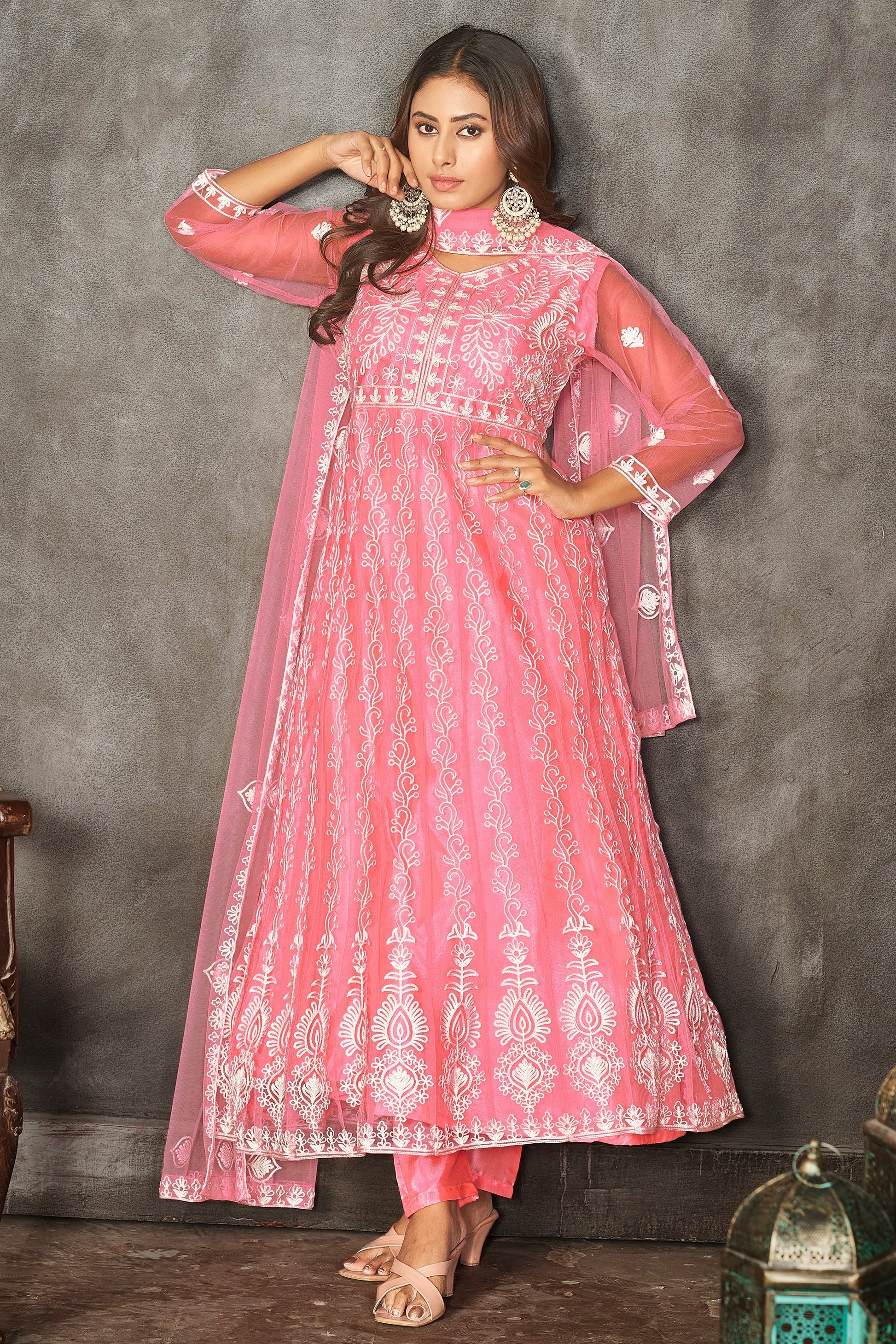नेट फैब्रिक गुलाबी रंग कढ़ाई विंसम अनारकली सूट