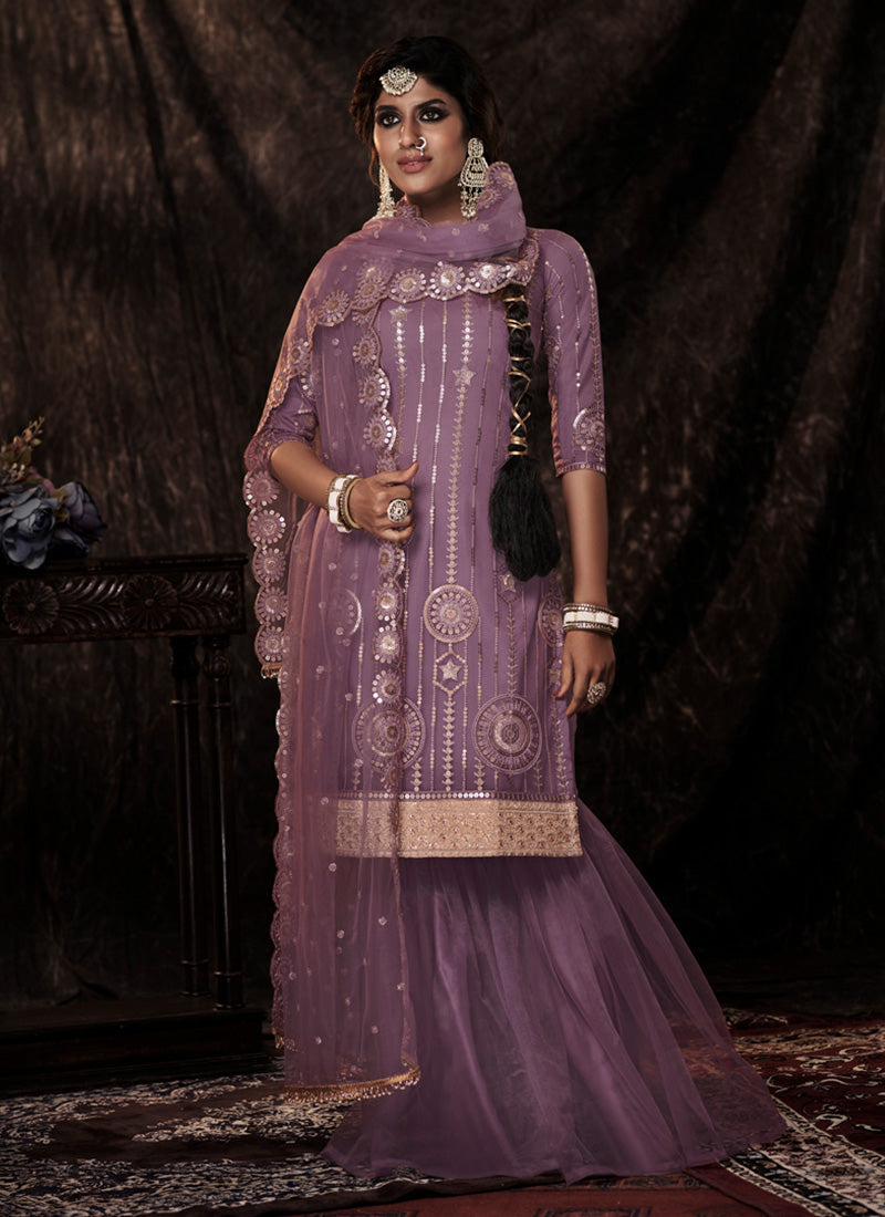 टेक्स्ट ब्लॉक प्याज गुलाबी रंग कोहनी आस्तीन पूरी तरह से सेक्विन काम शरारा सूट