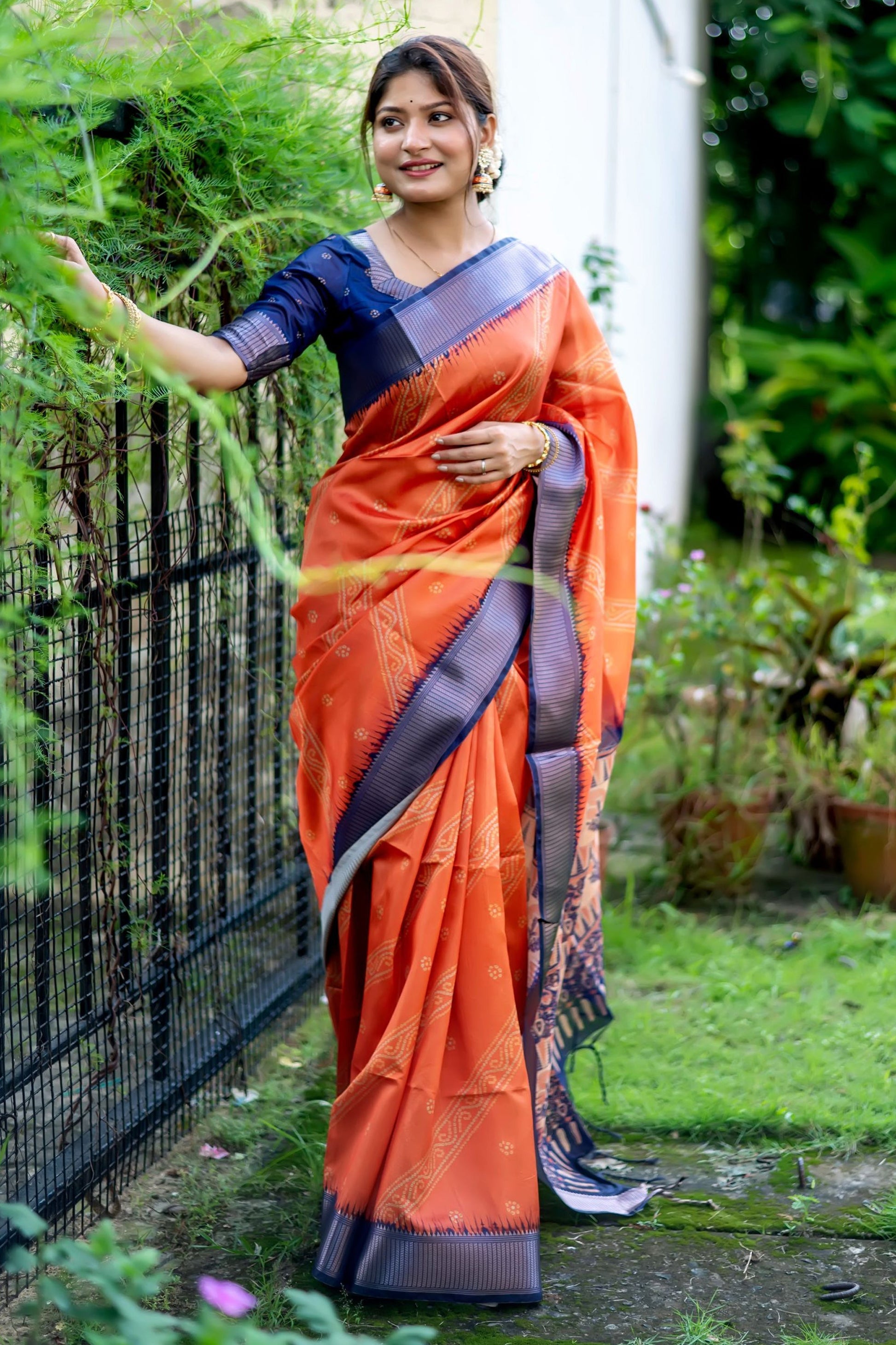 मनमोहक रीच कलर कैज़ुअल आर्ट सिल्क साड़ी की चमक का आनंद लें। उच्च गुणवत्ता वाले कच्चे रेशम से निर्मित, यह 5.5 मीटर लंबी साड़ी एक बेहतरीन बांधनी प्रिंट के साथ आती है जो इसे किसी भी अवसर के लिए एक शानदार पहनावा बनाती है। साड़ी के साथ मैचिंग 0.80 मीटर का ब्लाउज़ भी है, जो कच्चे रेशम के कपड़े से उतना ही शानदार है। जरी डिज़ाइनर वर्क की बुनाई प्रिंट को हाइलाइट करती है, जो इसकी खूबसूरती को बढ़ाती है। ध्यान रखें, रंग में थोड़ा अंतर हो सकता है। इसे ड्राई क्लीनिंग प्रक्रिया का उपयोग करके साफ़ करें। आपका ऑर्डर लगभग 7 कार्य दिवसों में भेज दिया जाएगा। इस खूबसूरत बांधनी प्रिंटेड साड़ी के साथ अपने फैशन सेंस को शान से दिखाएँ!