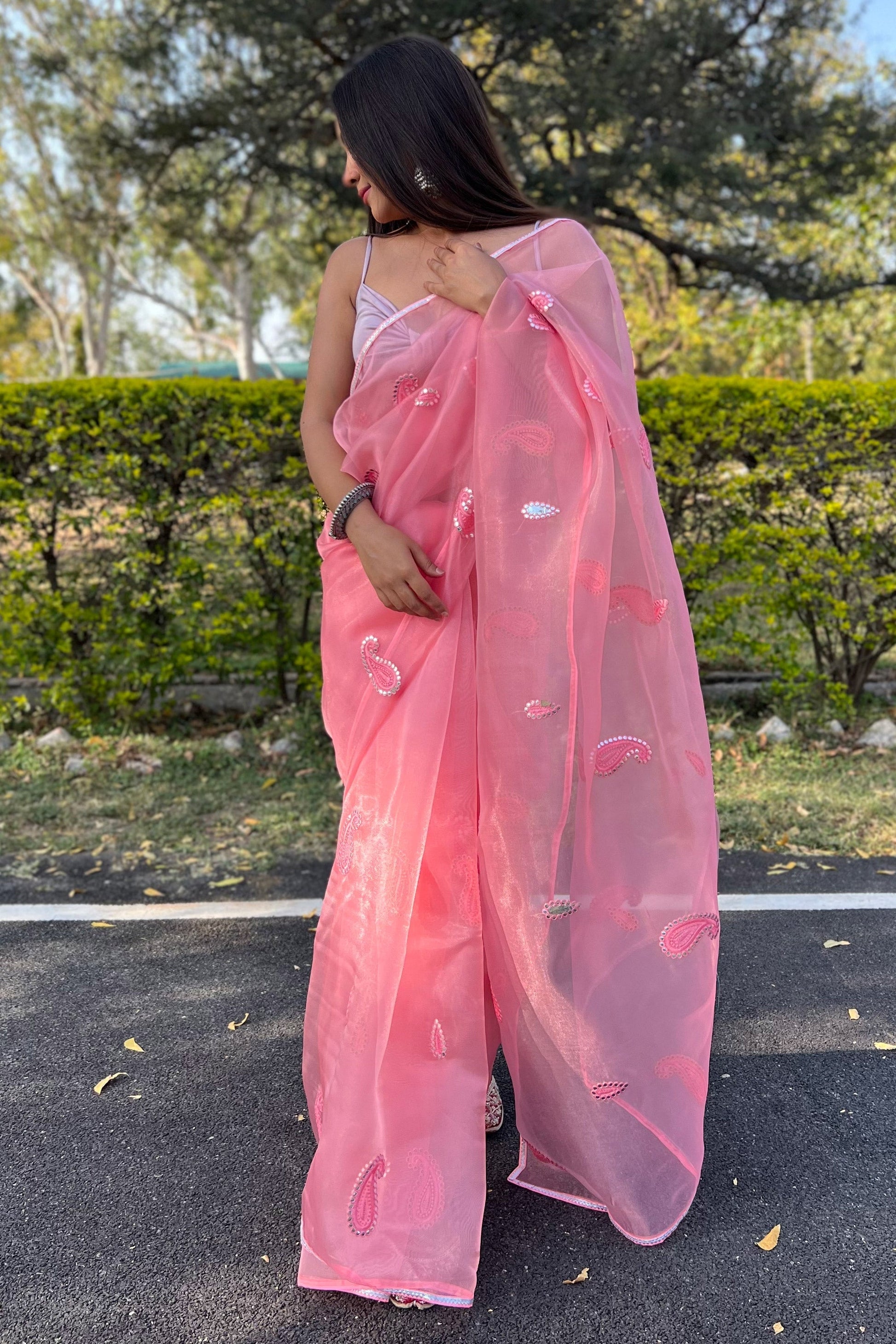 ऑर्गेंज़ा पिंक बेहतरीन कढ़ाई वर्क वाली साड़ी ब्लाउज के साथ