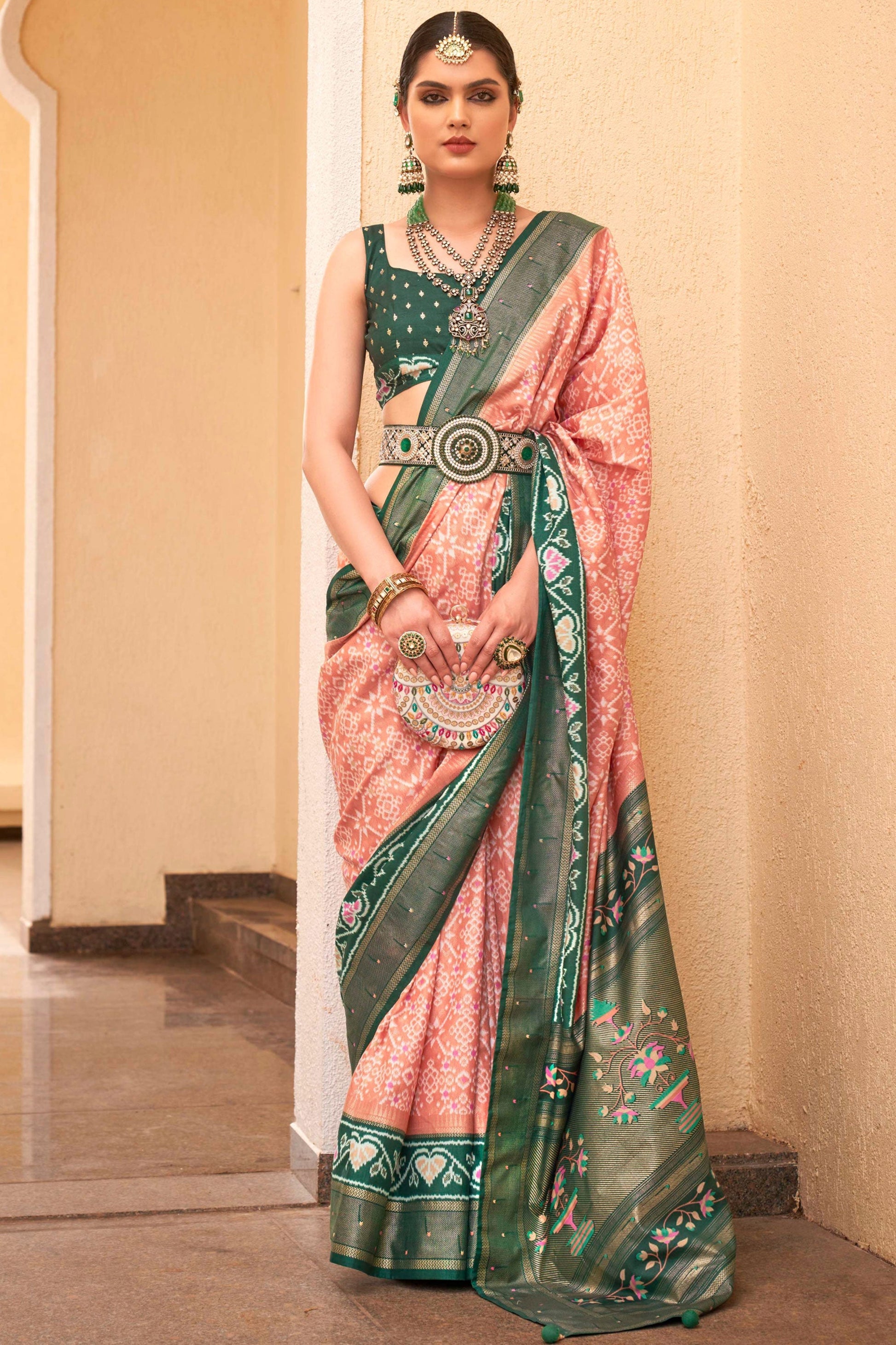 पटोला सिल्क पीच कलर प्रिंटेड साड़ी