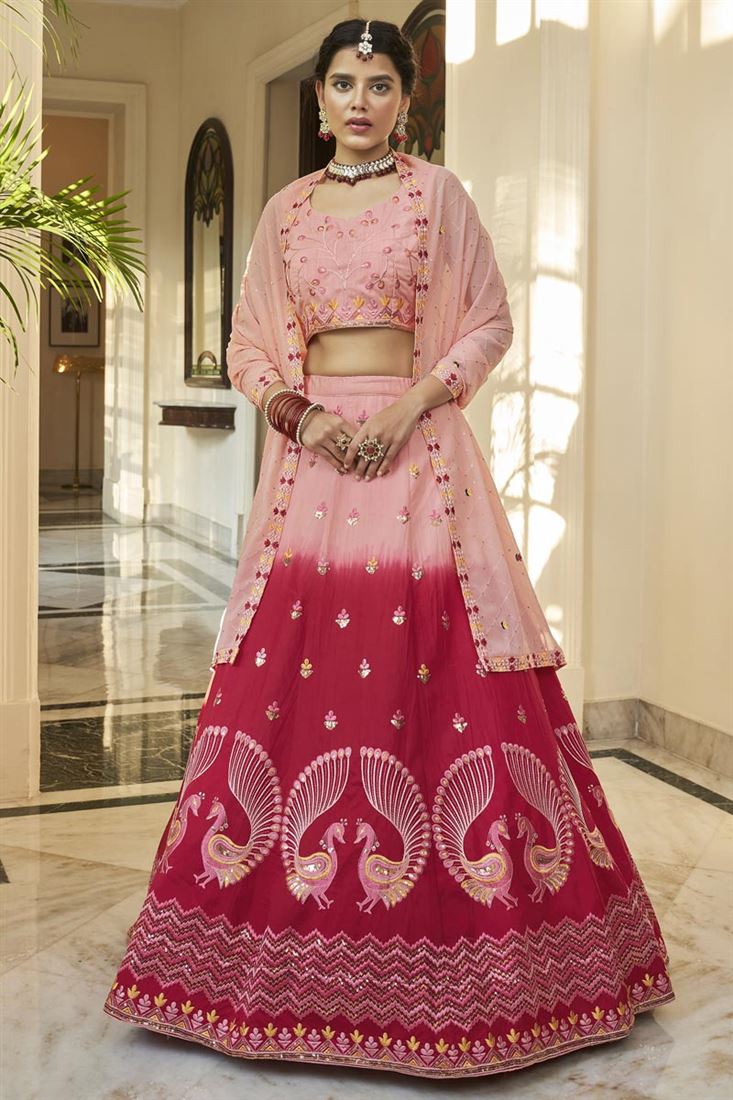 पीच कलर आर्ट सिल्क फैब्रिक संगीत वियर सुंदर लहंगा