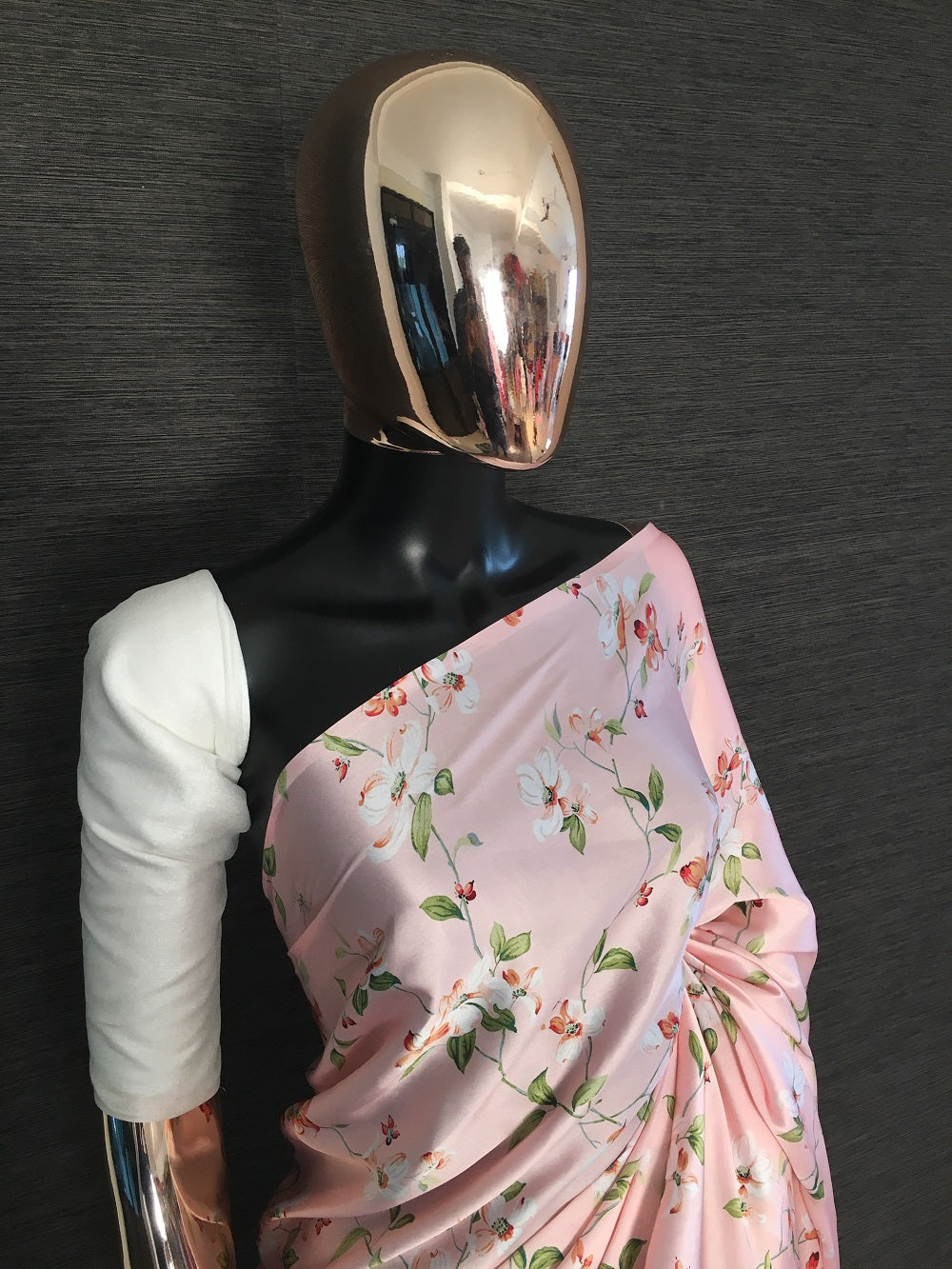 पीच कलर फ्लोरल डिजिटल प्रिंटेड जापान साटन साड़ी