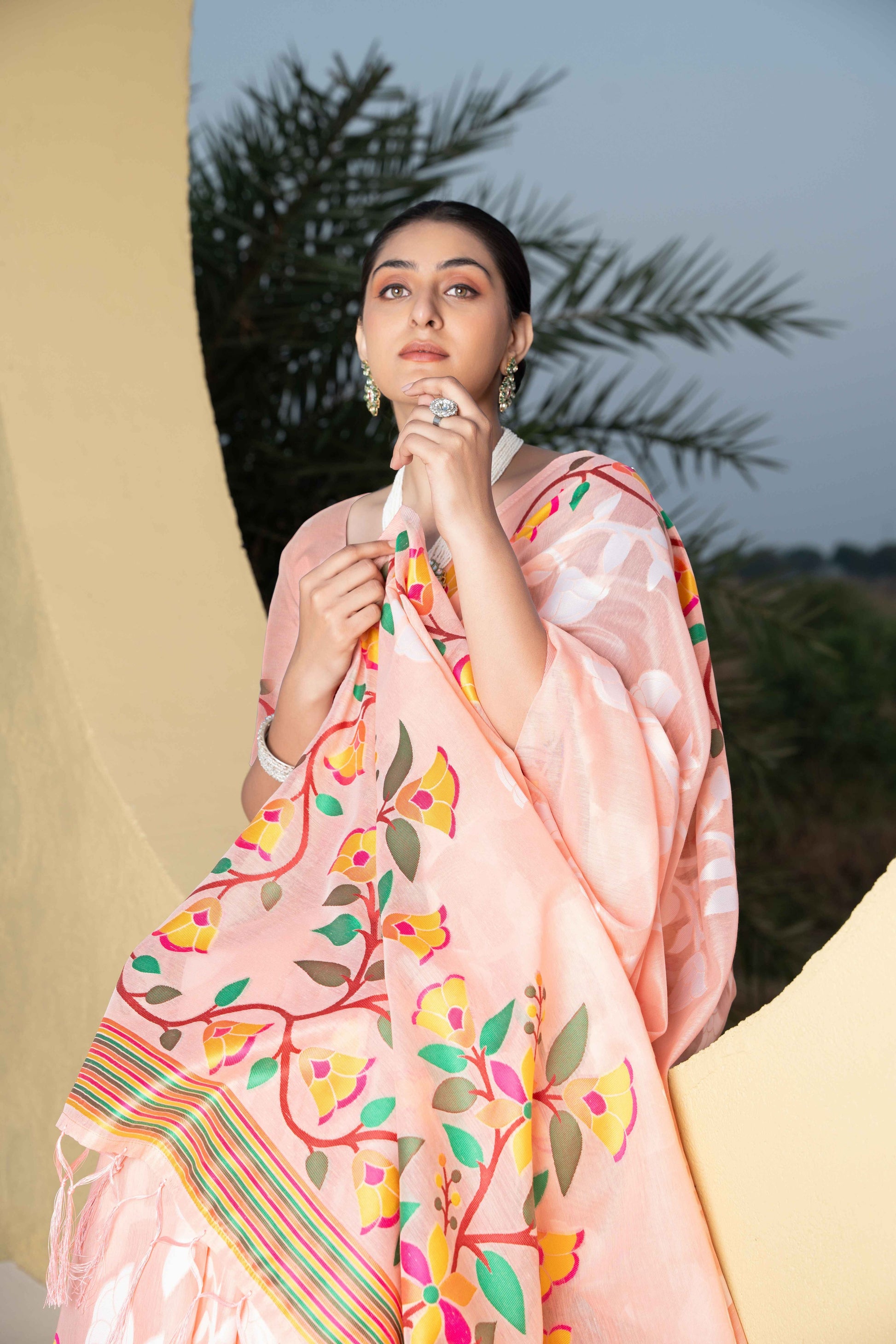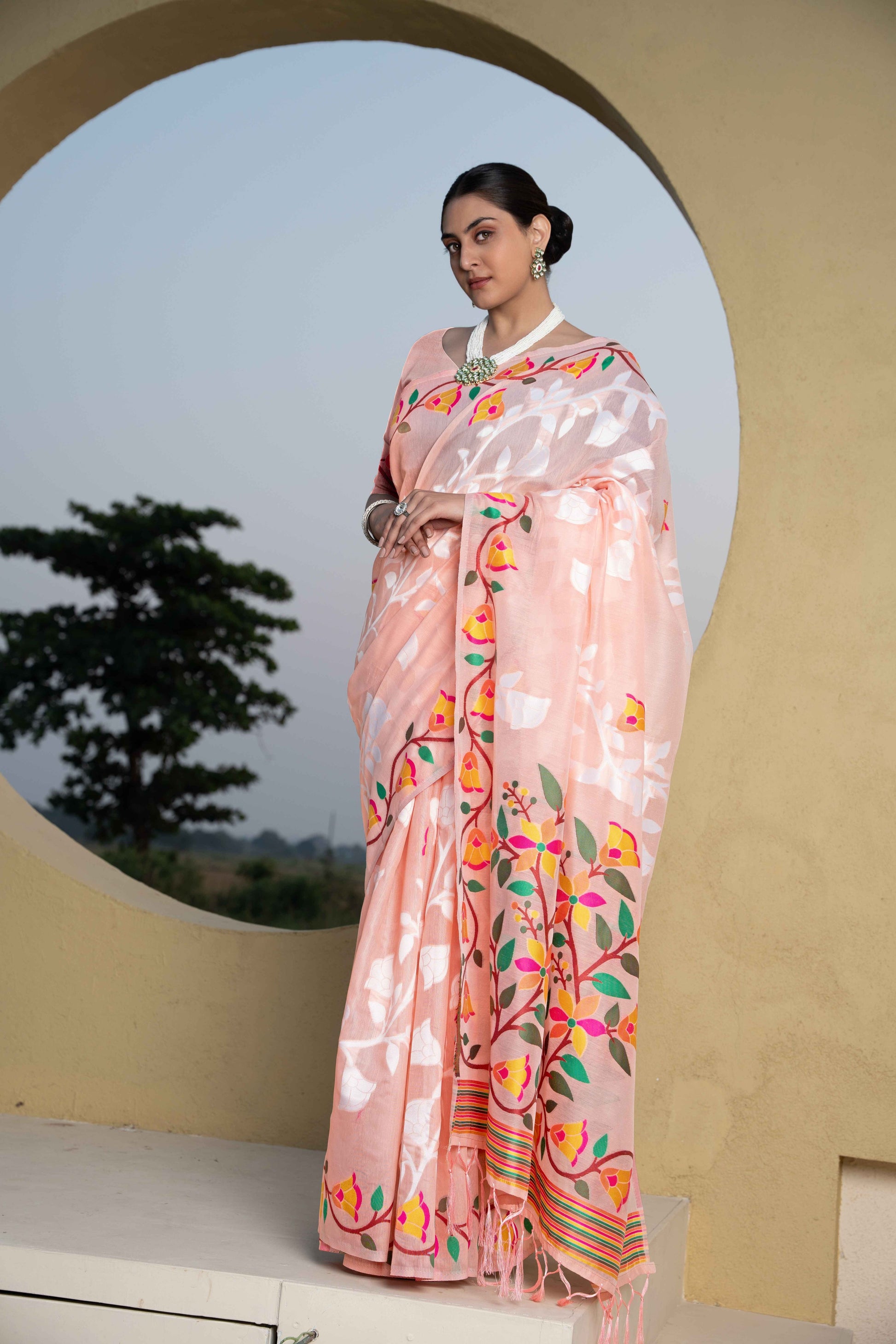 पीच कलर जामदानी सॉफ्ट कॉटन साड़ी अनस्टिच्ड ब्लाउज पीस के साथ