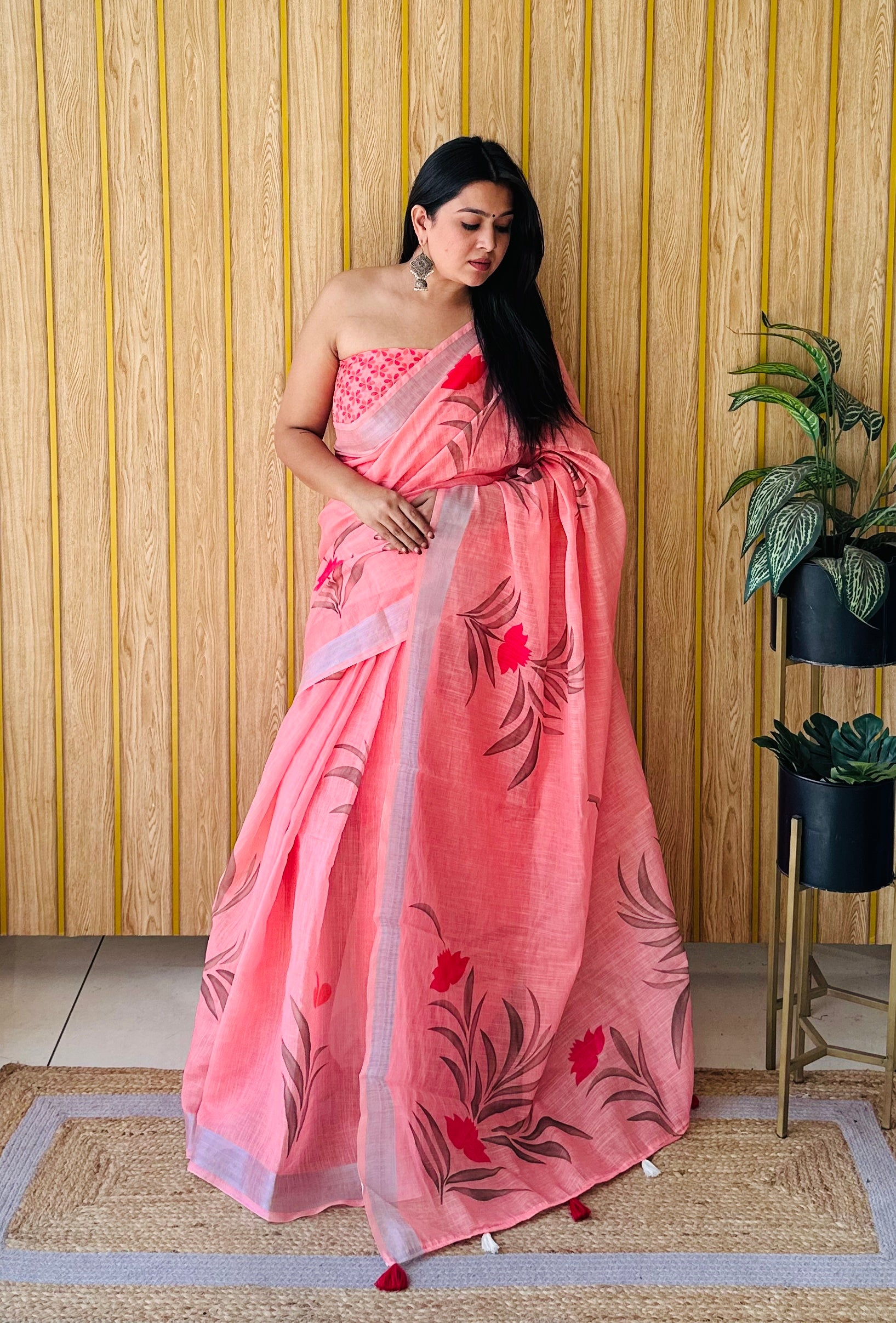 पीच कलर प्रीमियम क्वालिटी सॉफ्ट लिनन कॉटन डिजिटल प्रिंट साड़ी सिल्वर बॉर्डर के साथ