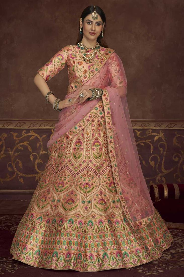 पीच कलर का संगीत वियर आर्ट सिल्क फैब्रिक लहंगा कढ़ाई वर्क के साथ