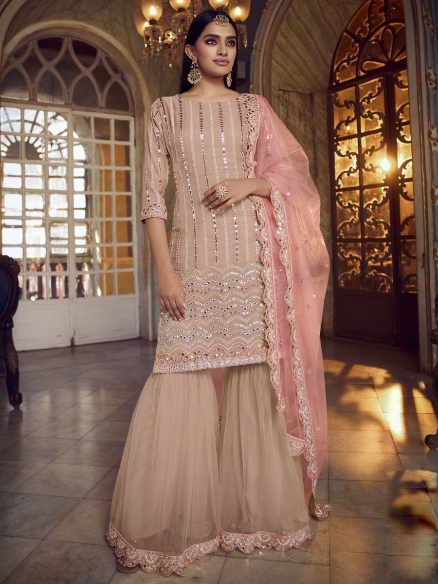 पीच ऑर्गेंजा पार्टीवियर शरारा सूट