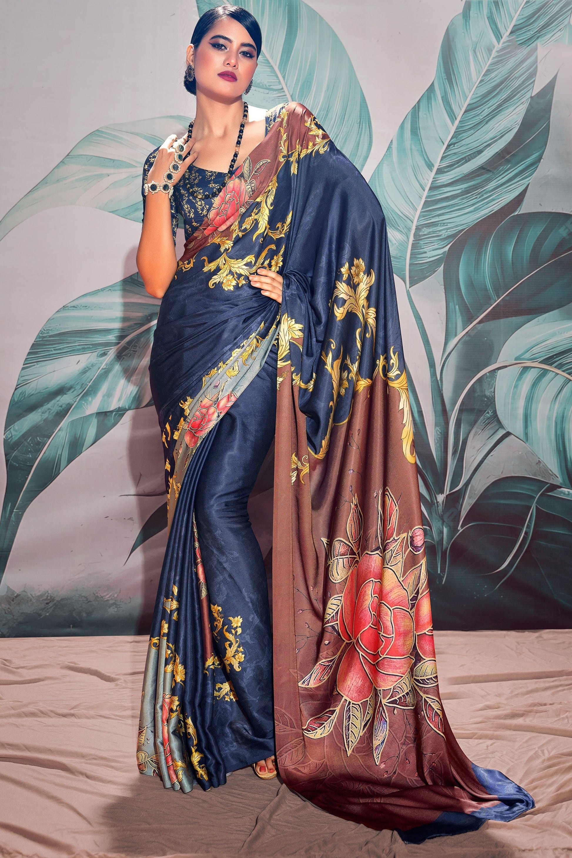 अभूतपूर्व डिजिटल मुद्रित नेवी ब्लू रंग साटन कपड़े साड़ी
