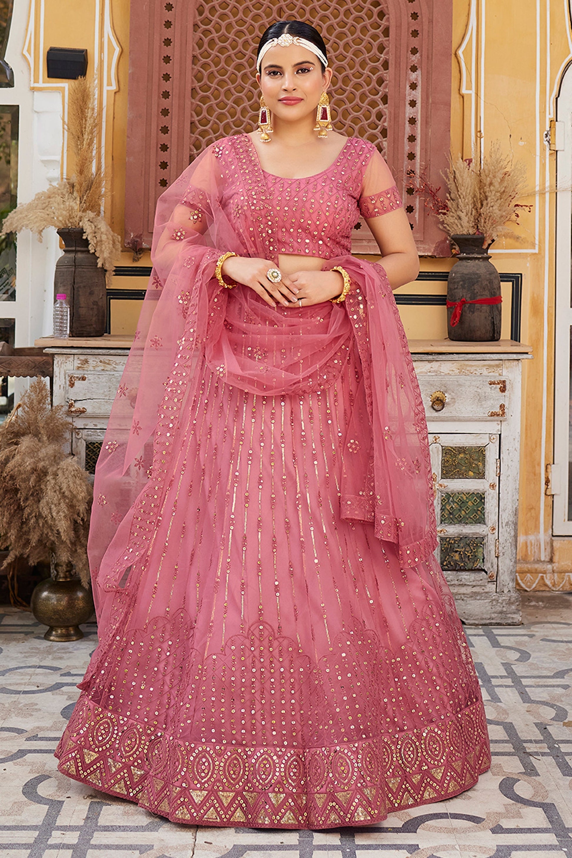 शानदार सेक्विन वर्क पिंक कलर नेट फैब्रिक लहंगा
