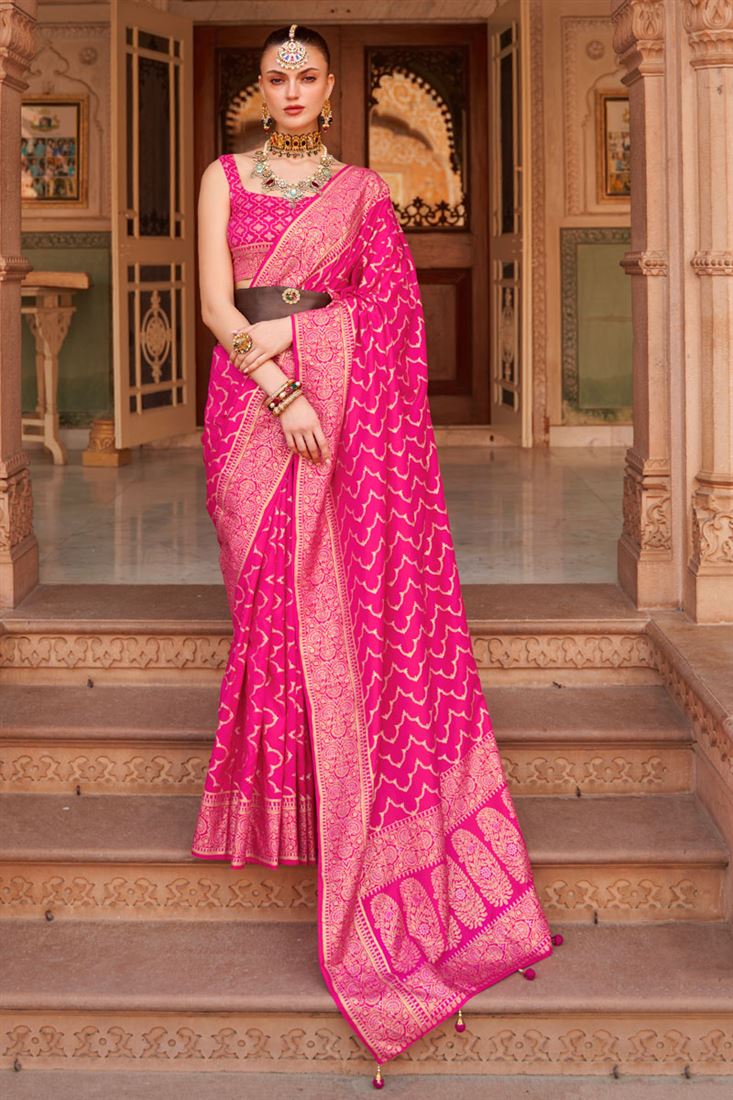 टेक्स्ट ब्लॉक गुलाबी रंग बनारसी स्टाइल आर्ट सिल्क फैब्रिक साड़ी