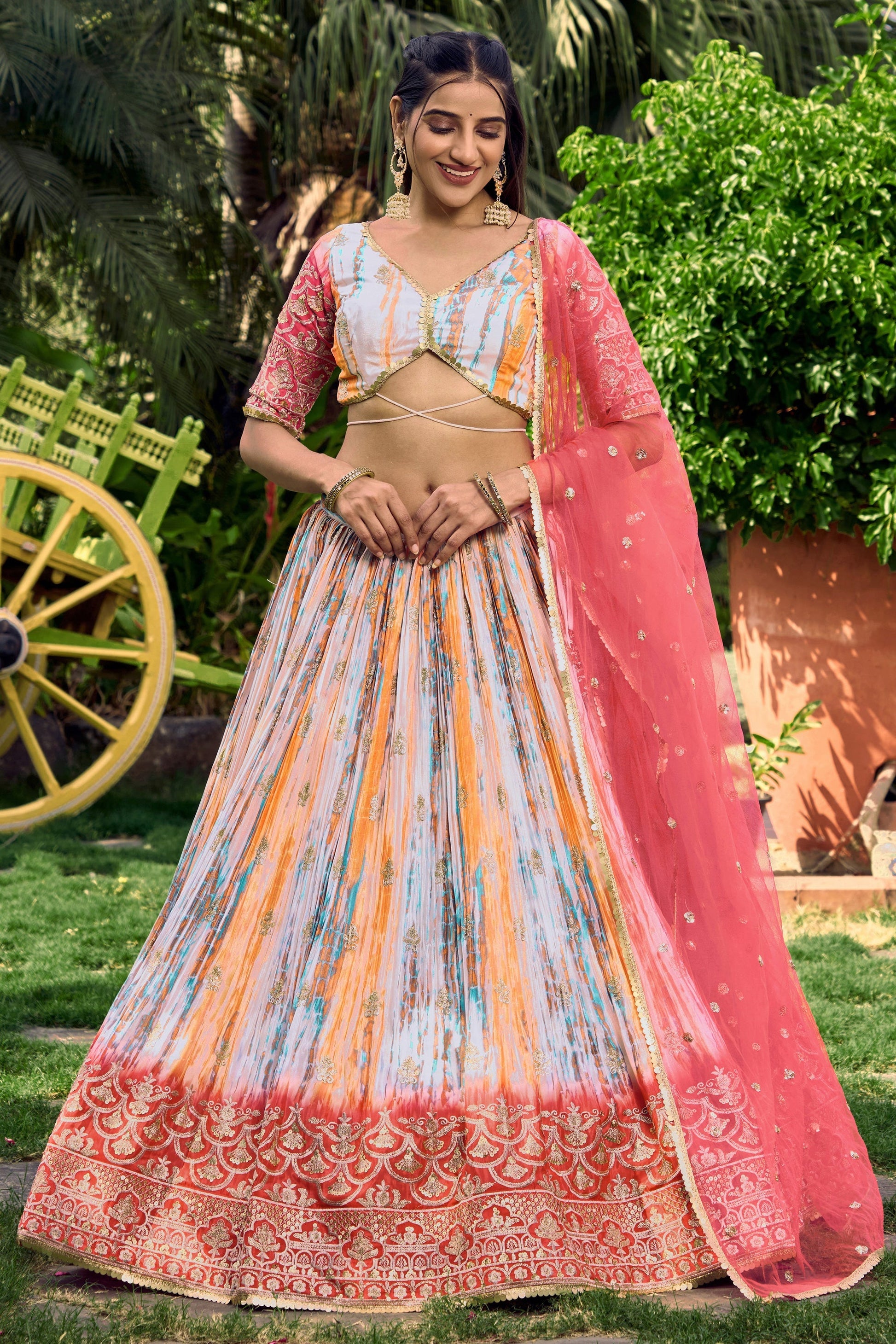 शानदार चिनॉन फ़ैब्रिक से तैयार और चमकदार सेक्विन वर्क से सजे हमारे डिज़ाइनर लहंगे के साथ स्पॉटलाइट में आएँ। फंक्शन वियर के लिए बिल्कुल सही, यह लहंगा शान और परिष्कार का एहसास कराता है।