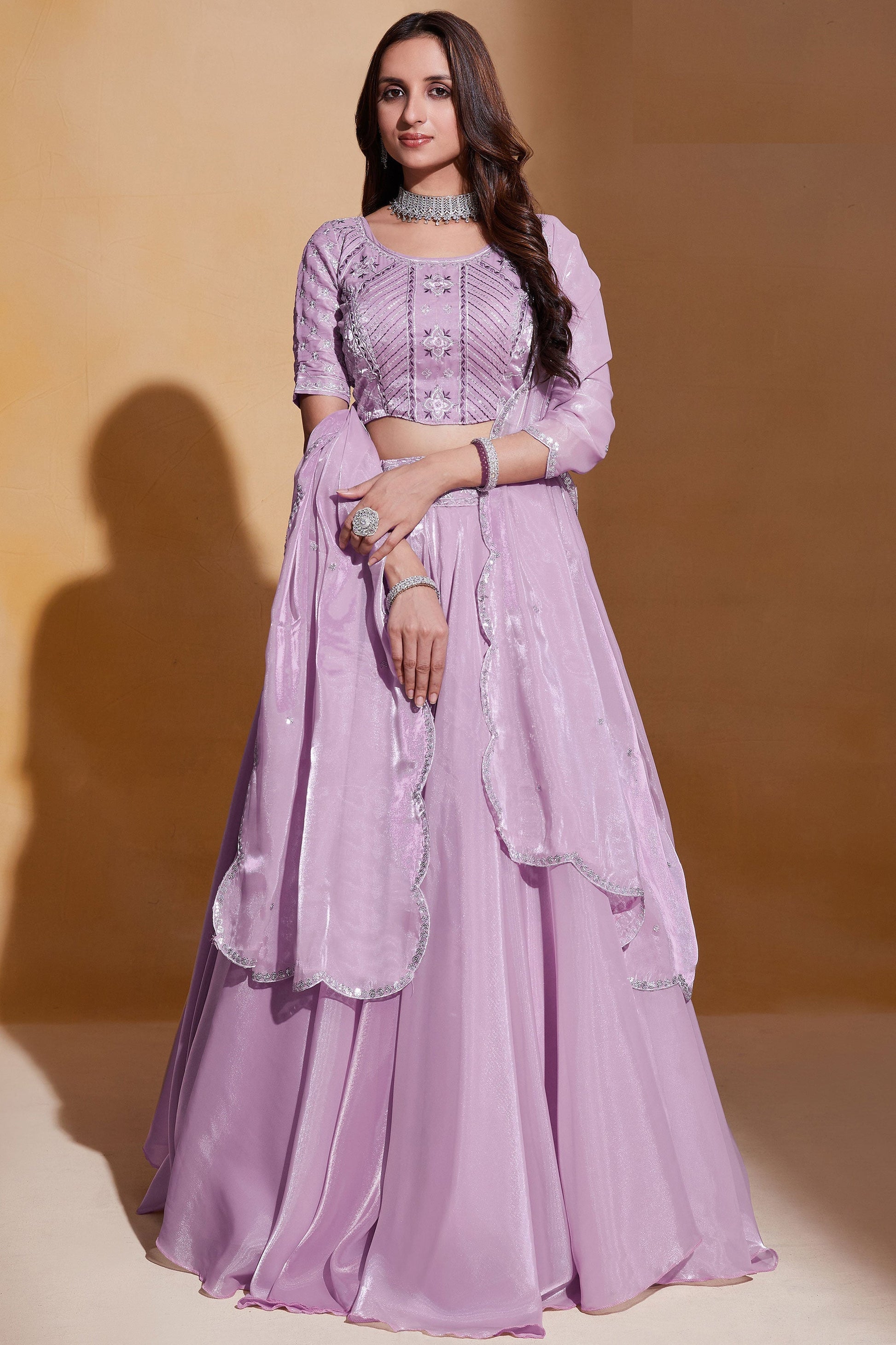 ऑर्गेंजा सिल्क फैब्रिक में गुलाबी रंग की कढ़ाई वाला वेडिंग वियर लहंगा चोली