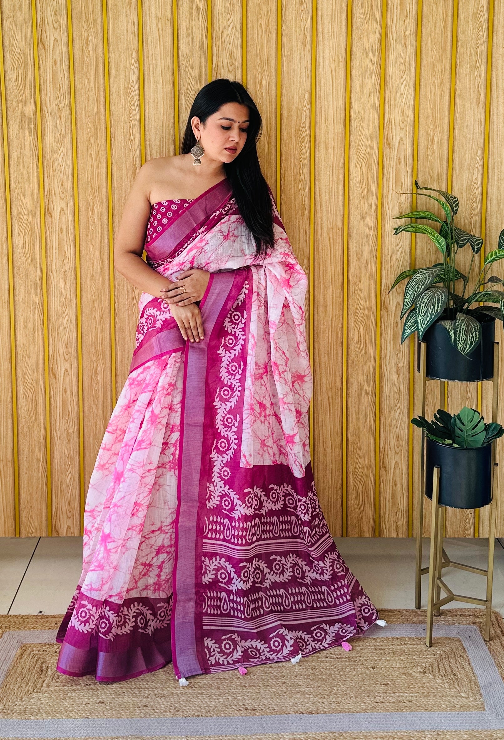 गुलाबी रंग की प्रीमियम क्वालिटी सॉफ्ट लिनन कॉटन डिजिटल प्रिंट साड़ी सिल्वर बॉर्डर के साथ