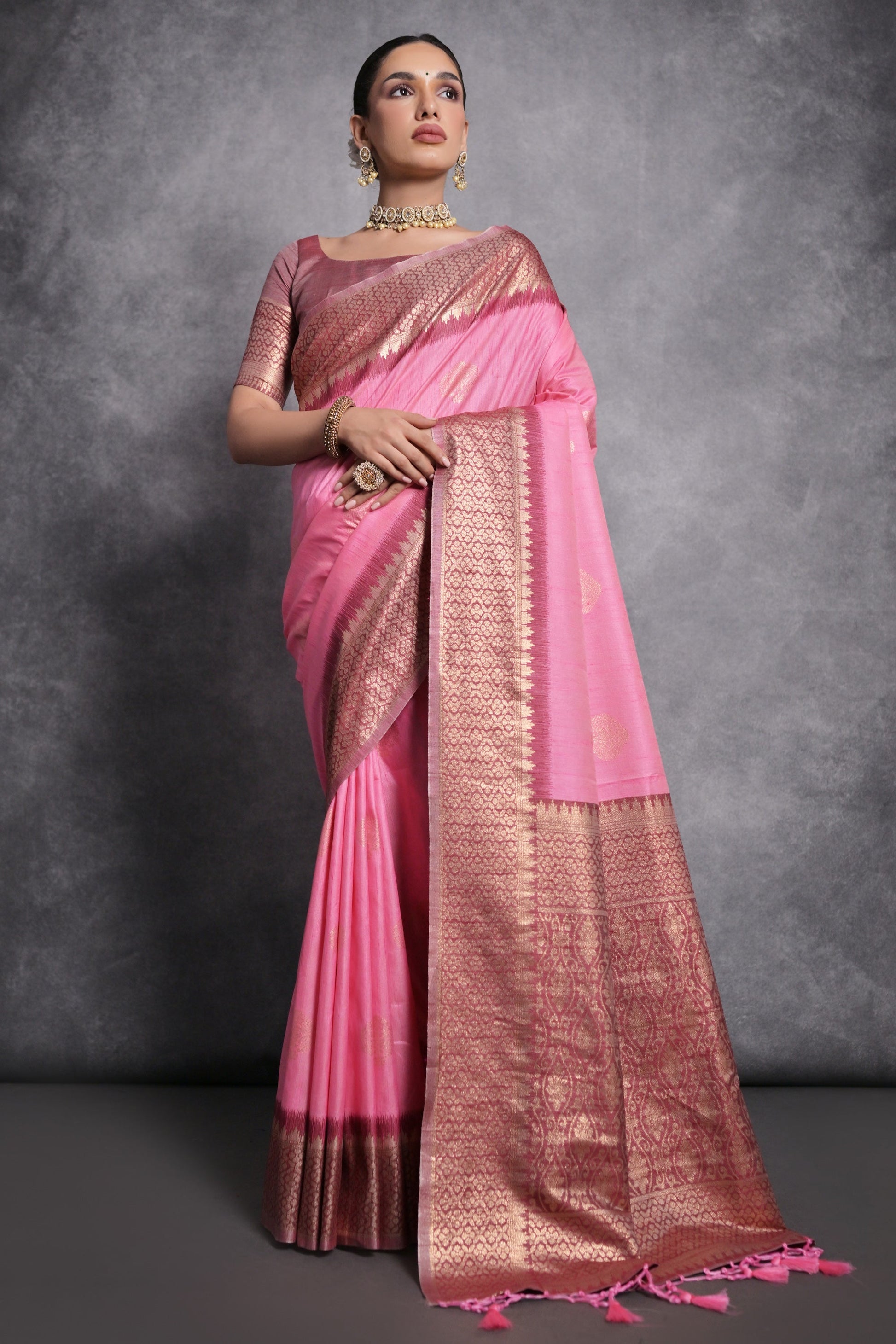 गुलाबी रंग की टसर सिल्क ज़री बुनाई बॉर्डर वर्क साड़ी